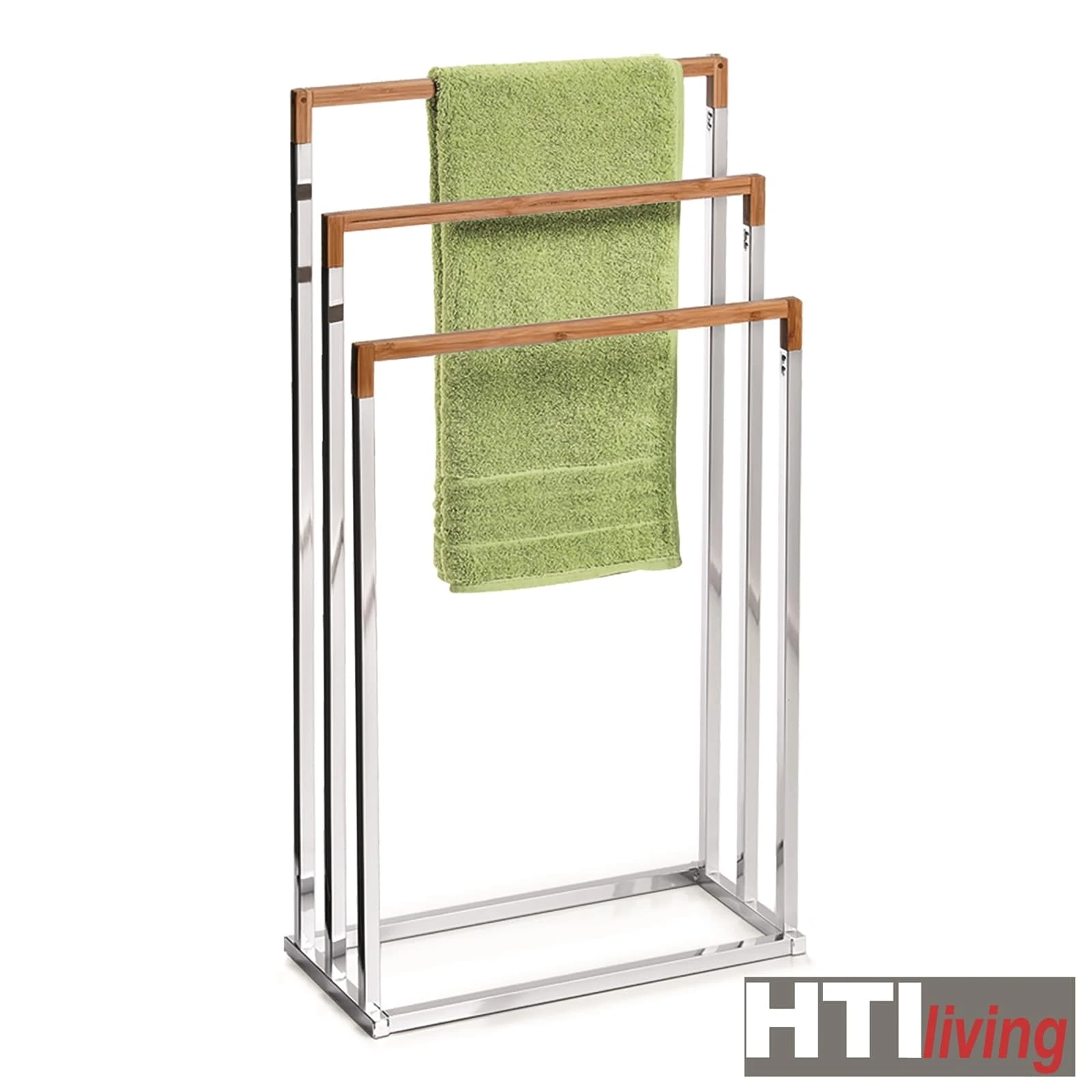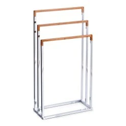 Dieser Handtuchständer aus Bambus ist freistehend und bietet auf seinen drei Armen viel Platz für Hand- und Duschtücher.