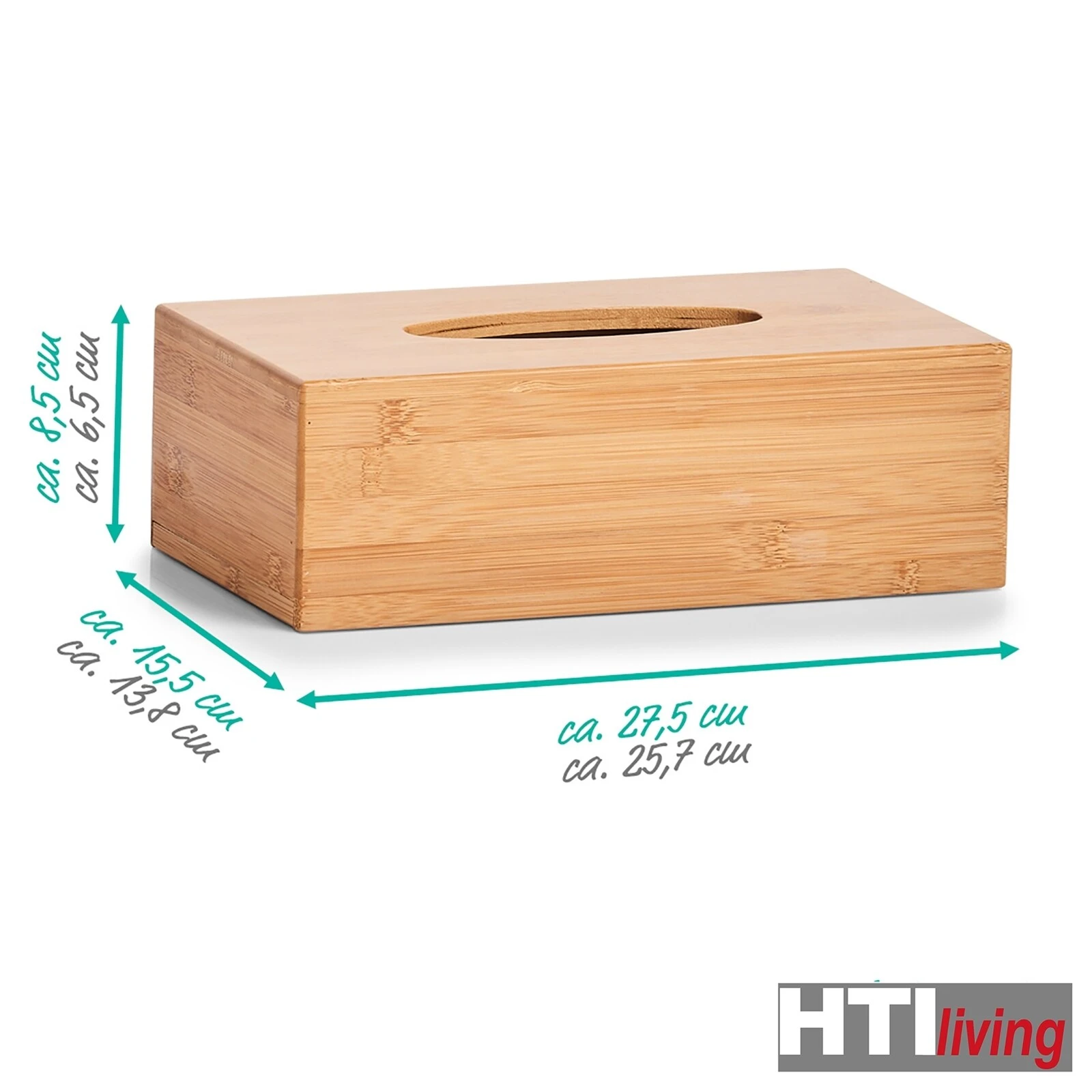 Diese praktische und hochwertig verarbeitete Kosmetiktücher-Box aus Bambus stellt handelsübliche Kosmetiktücher-Packungen dekorativ als Wohnaccessoire in Szene. Die schicken Boxen schmücken Ihr Wohnzimmer, Esszimmer oder auch Ihr Bad. Der Boden ist für einen einfachen Wechsel aufschiebbar. Maße 27,5 x 15,5 x 8,5 cm