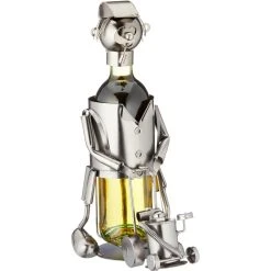 Dieser verspielte Weinflaschenhalter in der Auführung “Rasenmäher” ist aus vernickeltem Metall gefertigt.