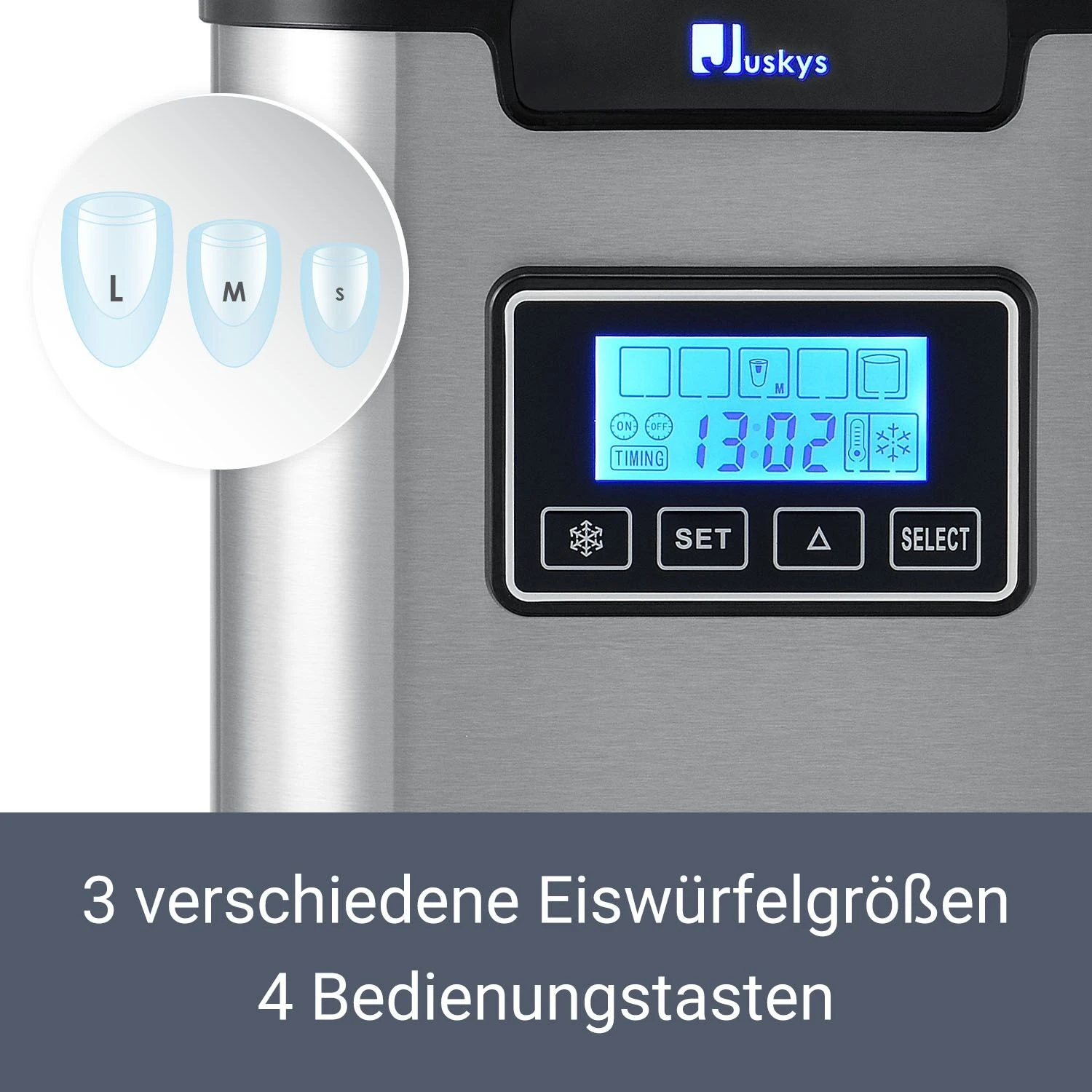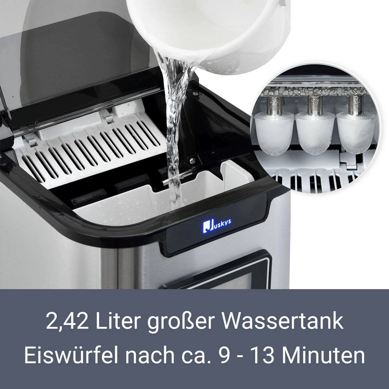 Der leistungsstarke Eisbereiter verfügt über einen großzügigen Wassertank mit 2,42 Liter Volumen, was in der Produktion 0,8 kg Eiswürfel entspricht. Innerhalb eines Tages können so bis zu 15 kg klare Eiswürfel hergestellt werden. Nach nur 9-13 Minuten können Sie bereits die ersten Eiswürfel entnehmen und ein kühles Getränk „on the rocks“ genießen.