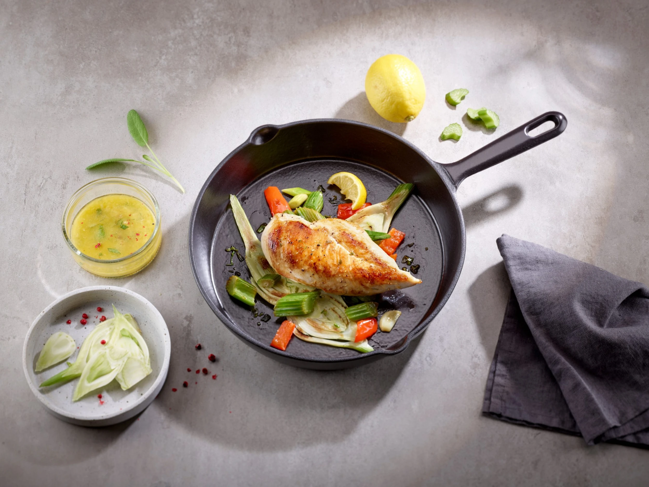 Dadurch erzielen Sie ein besonders gutes Bratergebnis. Die Pfanne hat einen Eisengussgriff und verfügt über 2 Ausgiess-Vorrichtungen.