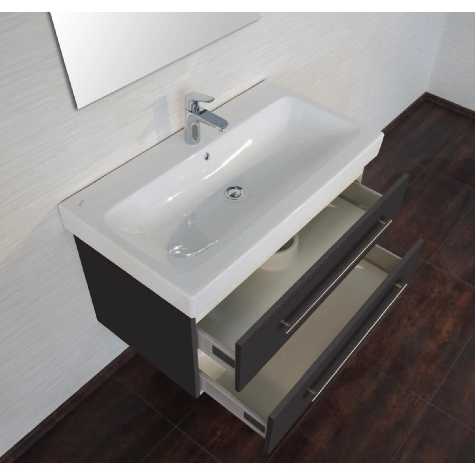 Die Zeit ist reif für etwas Neues. Gönnen Sie sich dieses Badmöbel inkl. KERAMAG Waschbecken Icon 90cm und passendem Unterschrank in anthrazit Seidenglanz und erleben Sie, wie ein einfaches Möbelstück den Charakter Ihres Badezimmers komplett verändert. Dies liegt nicht zuletzt an den klassisch-schicken Farben, die Ihnen hier angeboten werden: der Waschtisch erstrahlt in herrlichem anthrazit Seidenglanz, ebenso wie die beiden Griffe aus mattem Edelstahl, die an den 2 Softclose Schubladen angebracht sind. Das Keramik Waschbecken, vom deutschen Markenhersteller KERAMAG, in glänzendem Weiß gefärbt, bietet mit seinen breiten Rändern genügend Fläche für einen Seifenspender oder dekorative Elemente.