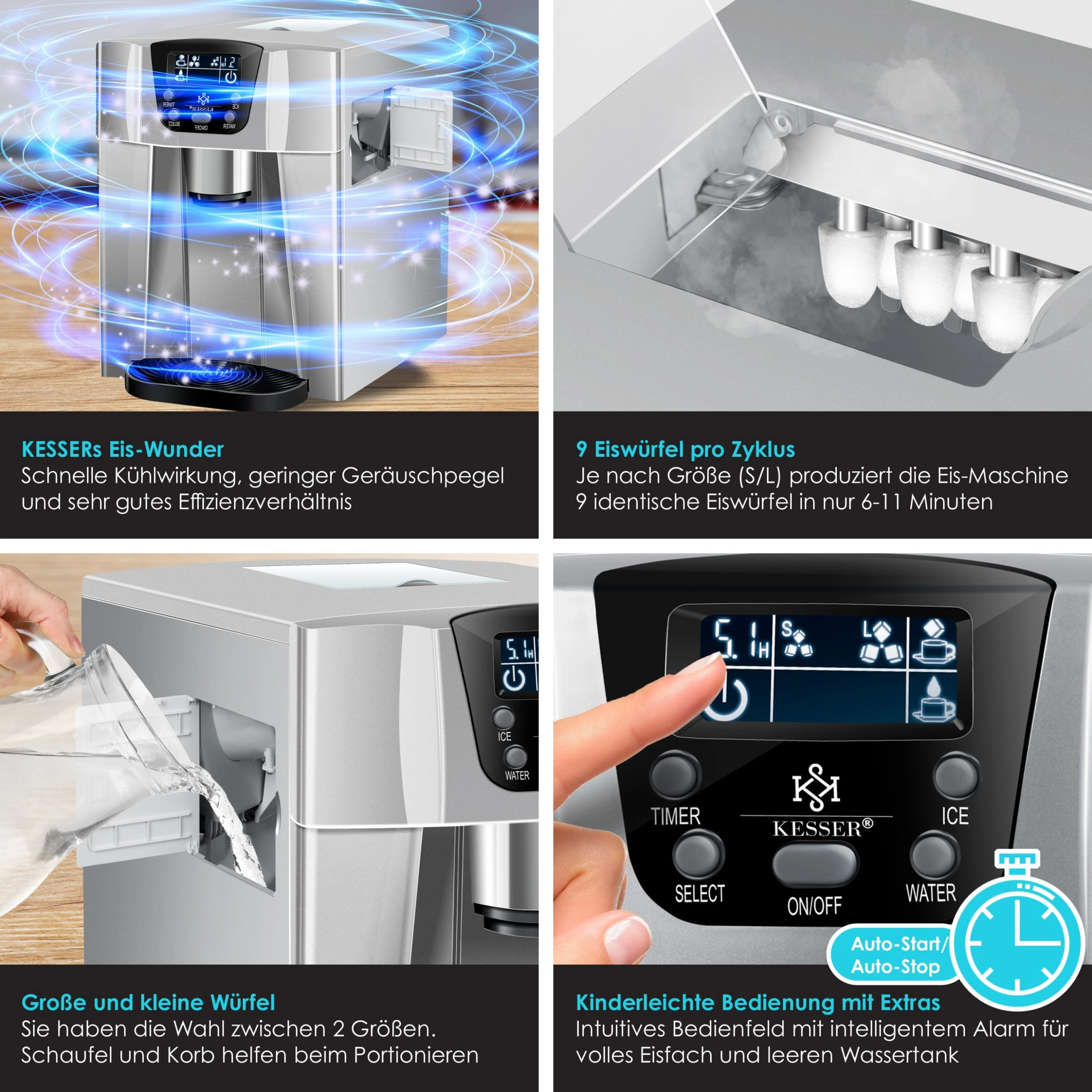 2 wählbare Eiswürfelgrößen Klein oder Groß, integrierte Timerfunktion für Eiswürfel auf Bestellung und einfache Bedienung mit übersichtlichem Display. Starke Leistung mit kleinen Maßen dank platzsparendem, elegantem Gehäuse. 2 Liter Wasser passen in den Tank, der sofort nach Befüllung mit der Produktion beginnt. Nach ca. 6 Minuten sind die ersten Würfel Fertig.