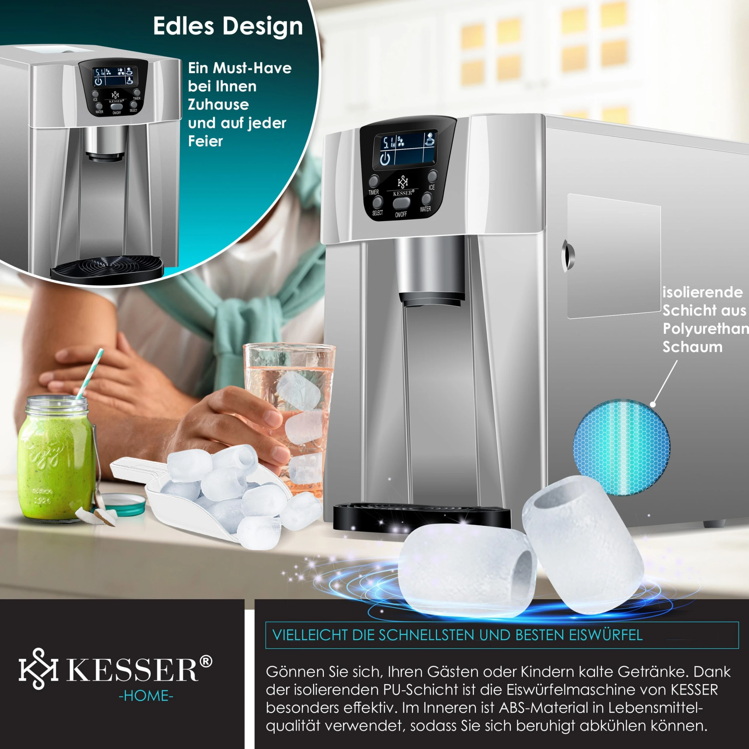Bedient wird der Eiswürfelbereiter über die Tasten direkt unter dem Display. Große, leicht verständliche Symbole machen jederzeit klar, welcher Betriebsmodus eingestellt wurde. Hier lässt sich auch der Ein-/Ausschalt-Timer programmieren. Der KESSER Eiswürfelbereiter hinterlässt selbstredend keinen üblen Nachgeschmack, denn sein Pumpsystem sowie seine Kunststoffauskleidung aus geschmacksneutralen Materialien gefertigt sind.