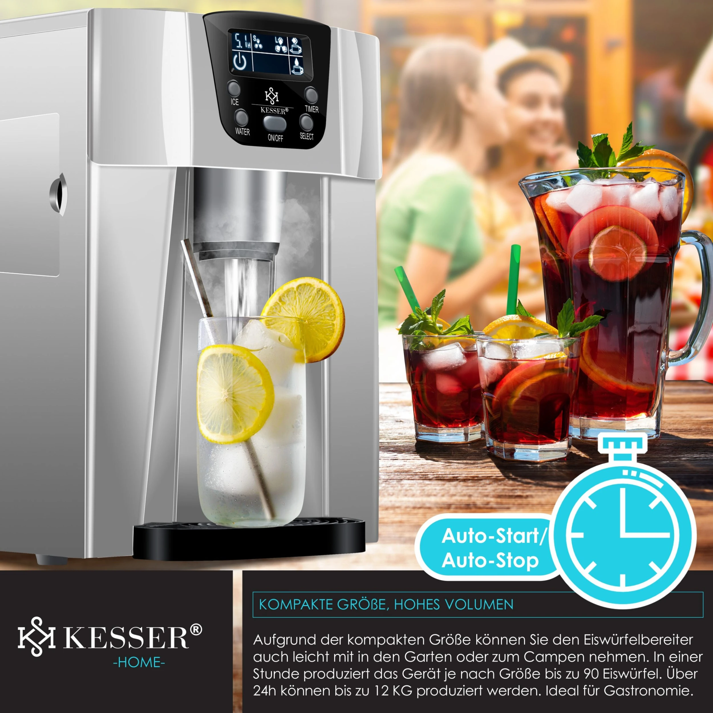 KESSER EISWÜRFELMASCHINE, Eiswürfel in nur ca. 6-8 Minuten und bis zu 12 Kg fertige Eiswürfel in 24 Stunden, leichte Bedienung über ein 5-Tasten LCD-Display, inkl. Timer und Sicherheitsschaltung