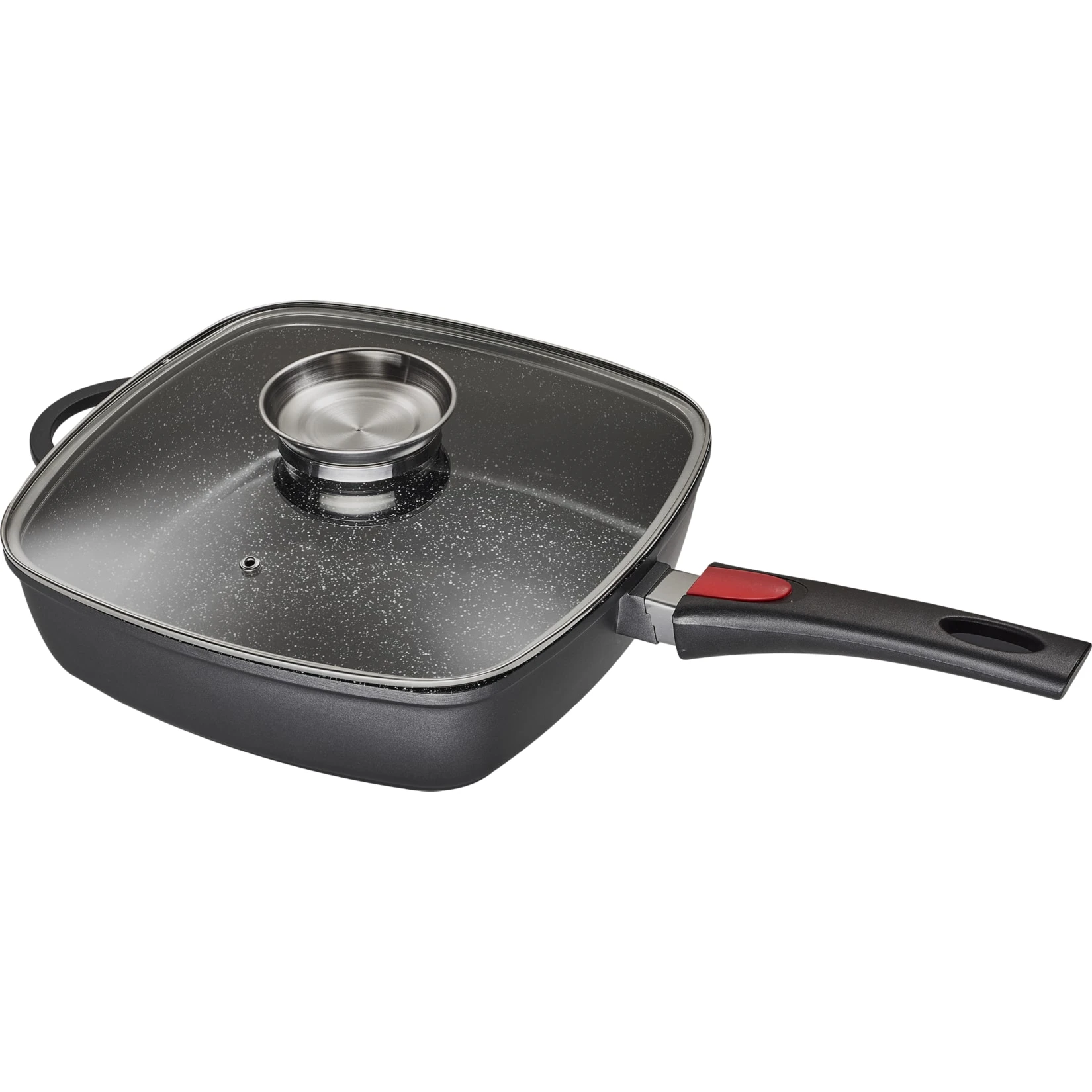 - Pfanne aus Aluguss mit Glasdeckel und Aromaknopf