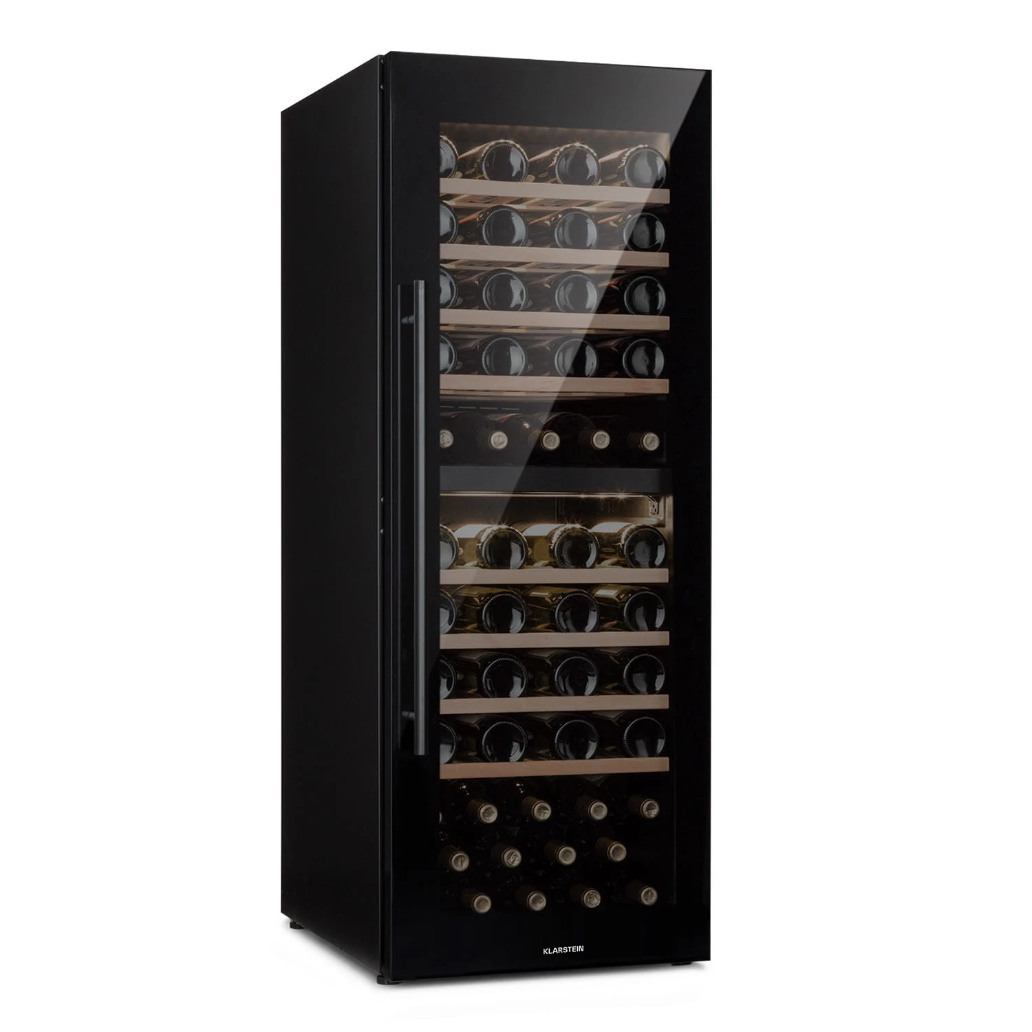 Klarstein Barossa 77 Duo Weinkühler Weinkühlschrank | Kompressionskühler | Volumen: 191 Liter / 77 Flaschen | Kühltemperatur: 5 – 20 °C | 2 Kühlzonen | weiße LED-Innenbeleuchtung | LED-Display mit Touch-Steuerung | schwarze Sicherheitsglasfront mit Panoramafenster | schwarz