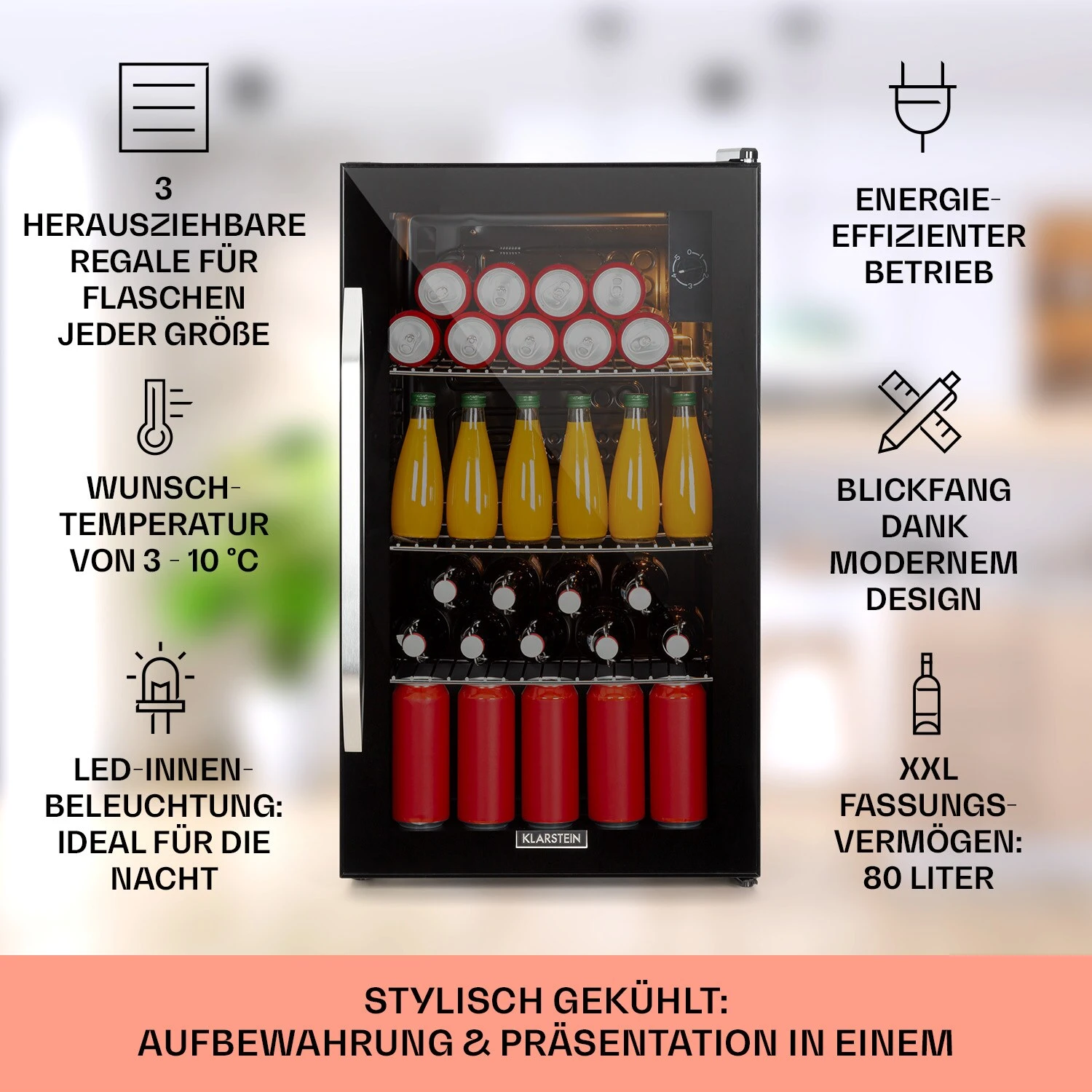 Mit seinen kompakten Maße ist der Klarstein Beersafe XXL Onyx Kühlschrank ganz groß in Sachen Stauraum: 80 Liter Nutzinhalt bieten auf drei Metallrosten viel Platz für eine reichhaltige Palette an Nahrungsmitteln von Joghurt und Käse über Fleisch bis zu Gemüse oder zur Kühlung von Erfrischungsgetränken. Zehn Einschübe mit jeweils 4 cm Abstand bieten verschiedene Möglichkeiten, den Innenraum flexibel zu gestalten. Für die Kühlung nach Wunsch stehen 5 Stufen zur Regulierung der Leistung auf 5 bis 10 °C zur Verfügung. Besonderen Eindruck macht der Beersafe XXL Onyx vor allem durch sein aufsehenerregendes Design: Eine Glastür mit schwarzem Rahmen erlaubt ständigen Einblick in den Innenraum des ebenfalls schwarzen Gehäuses. Ein separat zuschaltbares LED-Licht im Innern bringt in kühlweißem Licht kalten Glanz über die gelagerten Lebensmittel.