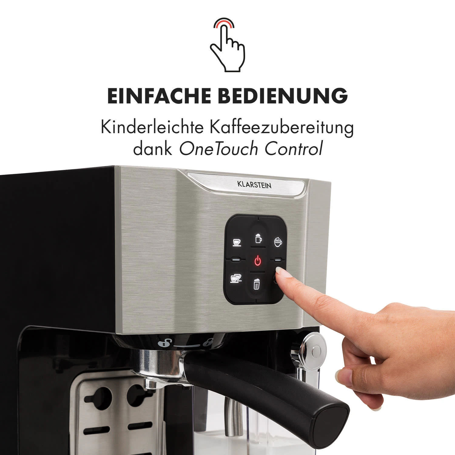 Mit kraftvollen 1.450 Watt Leistung und 20 Bar Druck presst die Klarstein BellaVita Kaffeemaschine heißes Wasser durch die gemahlenen Kaffeebohnen und entfaltet so ihr volles Aroma. Dank einer 3in1-Funktion kann das Hochdruck-Wunder neben Espresso auch Cappuccino und Latte Macchiato zubereiten. Ausschlaggebend hierfür ist ein Milchschäumer, der per Knopfdruck und Drehregler aufgeschäumte Milch in gewünschter Konsistenz produziert. Mit Hilfe eines abnehmbaren 0,4 L Milchschaum-Behälters steht somit immer genügend Milchschaum für mehrere Kaffeegetränke zur Verfügung. Grande Crema-Genuss für Espresso wie beim Italienier wird durch den perfekt eingestdellten Druck und austauschbare Edelstahlsiebe garantiert. Das Wasser hierfür stammt aus dem einfach abnehmbaren und leicht zu reinigenden 1,4 L Wassertank an der Rückseuite des Gerätes. Sämtliche Getränke können darüber hinaus bequem über ein Bedienfeld mit One-Touch Control ausgewählt werden und versprechen dank voreingestellter Programme höchste Qualität. Zu Reinigung der Kaffeemaschine bietet sich zudem ein Self Cleaning System an, der das Milchschaumsystem durch das Drücken der Reinigungstaste für 60 Sekunden säubert.