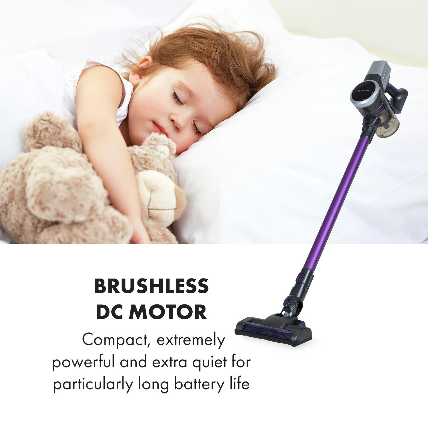 Klarstein Clean Butler 4G Silent Akku-Staubsauger | 0,8 l Behälter | motorisierte Teppich-Bodendüse | Silent Digital DC-Motor: bürstenlos / 160W / 80.000 U/min | Luftstrom: 54 m³/h | Vakuumleistung: 16 kPa | 2 Saugleistungsstufen | HEPA10-Filter | Betriebszeit: 20-35 Minuten | Akku-Kapazität: 22,2 V / 2200 mAh | Ladezeit: ca. 4 h | anthrazit / violett