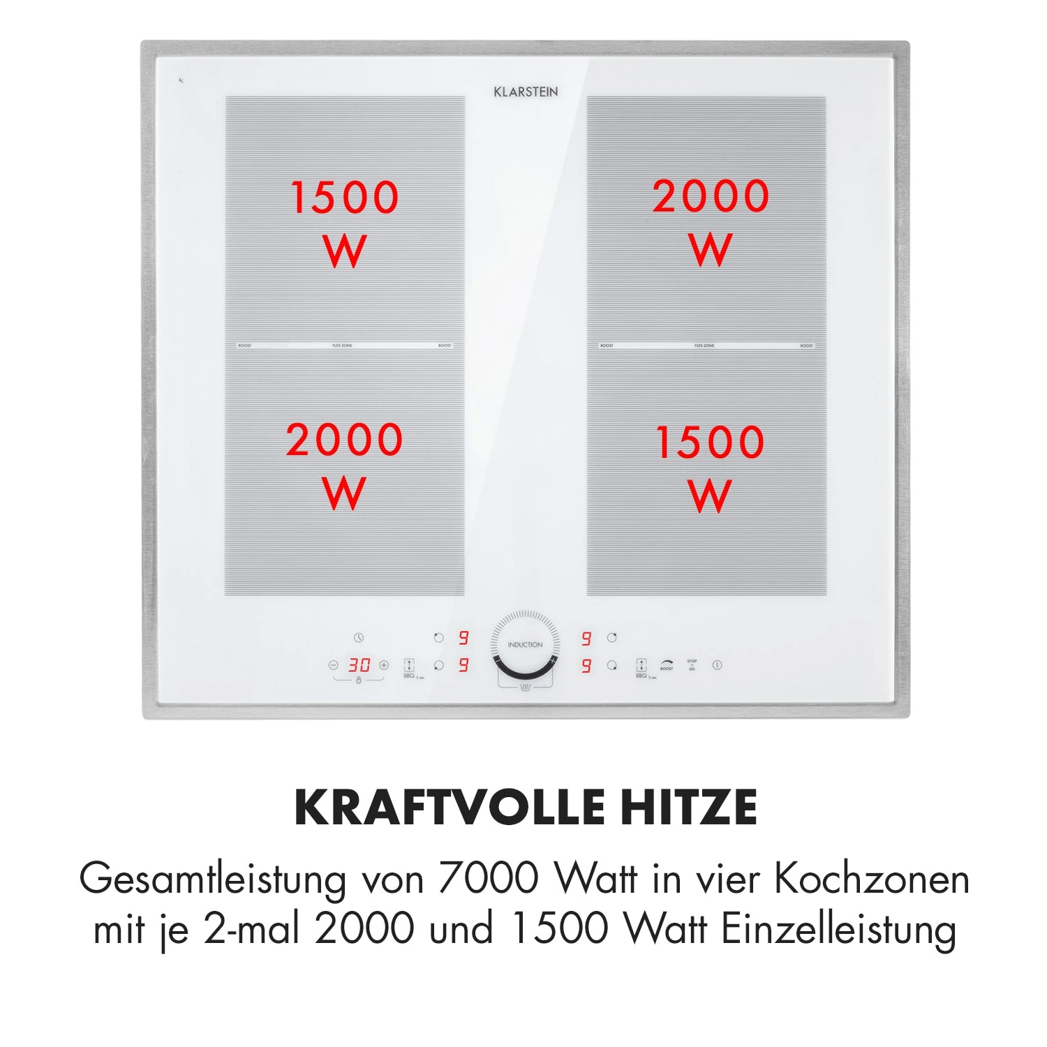Klarstein Delicatessa 60 Prime Induktionskochfeld | 60 cm | Einbau | autark | 4 Zonen: 7000 W | Edelstahlrahmen | 9 Stufen | Booster | Flexzonen | Restwärmeanzeige | Stop & Go | Topferkennung | Timer | Touch Control | Glaskeramik | Kochplatte | weiß
