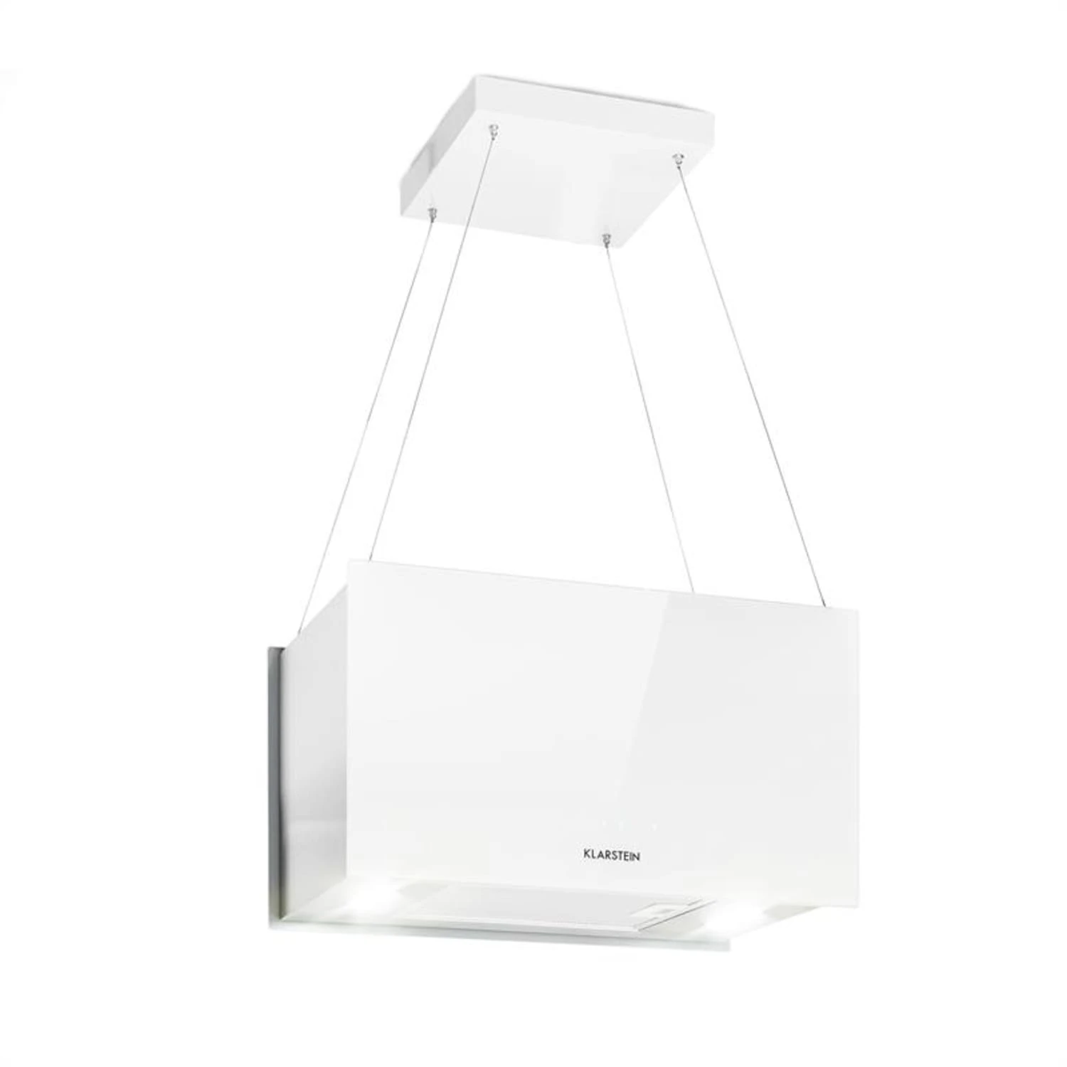 Klarstein Kronleuchter L Dunstabzugshaube Deckenhaube Inselabzugshaube | 60 x 35 cm (LxB) / 60 cm Abhängung | Umluftbetrieb in 3 Stufen | SenseControl: Touch-Bedienfeld | Umluftleistung: 590 m³/h | LED-Kochflächenbeleuchtung: 2 x 1,5 W | Energieeffizienzklasse A | Geräuscharm: 58 dB | Pure Ambience: 5 mm Sicherheitsglas weiß