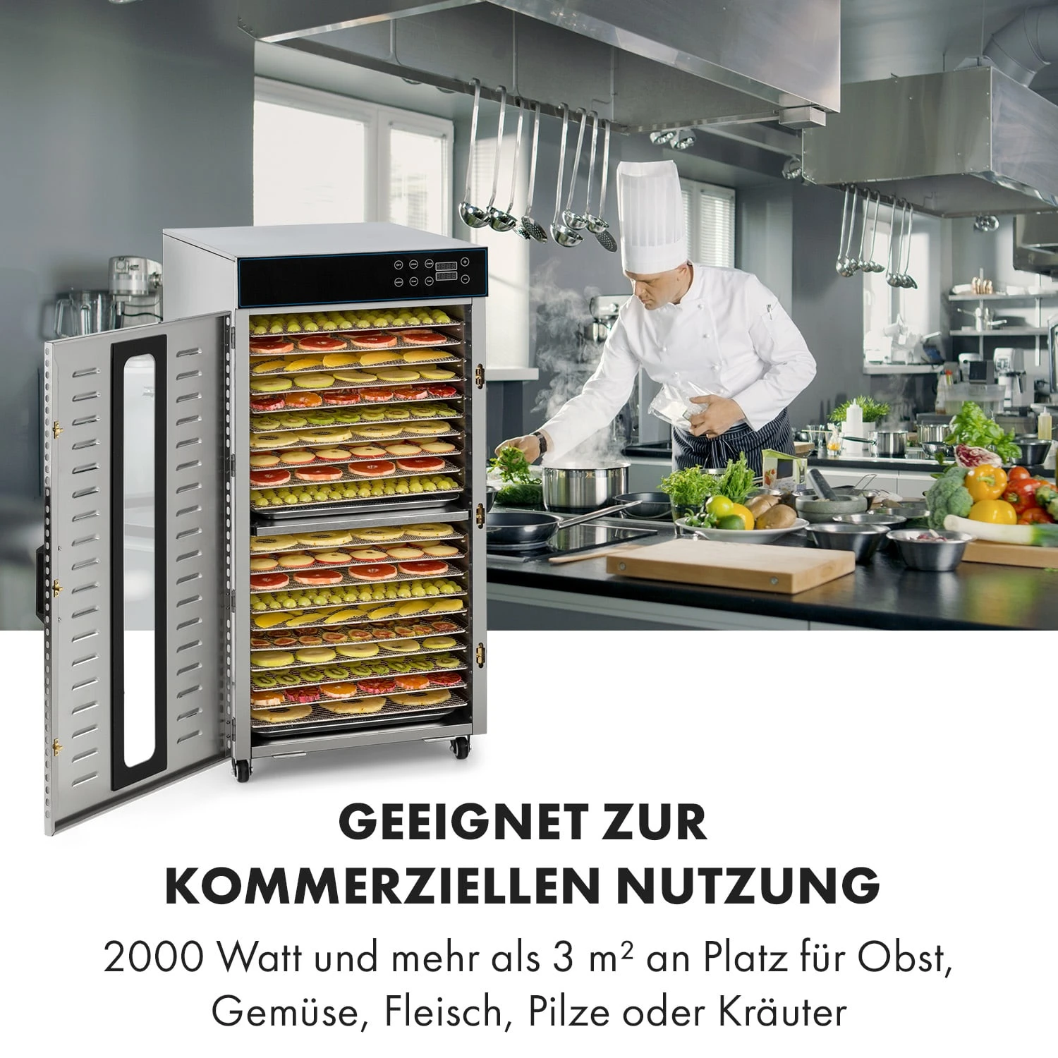 Klarstein Master Jerky 300 Pro Dörrautomat Profi / Gastro | Mit 20 Etagen | 2000 W | Kapazität: 3,04 m² | Thermostat: 40-90 °C | 25 kg Obst / Gemüse | Gehäuse aus rostfreiem Edelstahl | Bodenrollen | Dörrgerät | Früchtetrockner | Dehydrator | Edelstahl Gehäuse