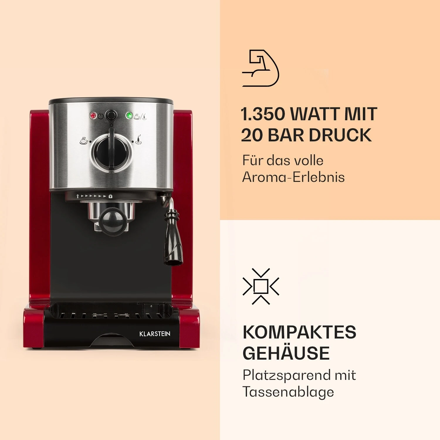 Klarstein Passionata Rossa 20Espressomaschine | Cappuccino | Milchschaum | Siebträger | max. 1.350 Watt Leistung | 20 Bar | 1,25 Liter Wassertank für 6 Tassen | auch für Espresso-Pads | abnehmbarer Wassertank | Edelstahl | Rot