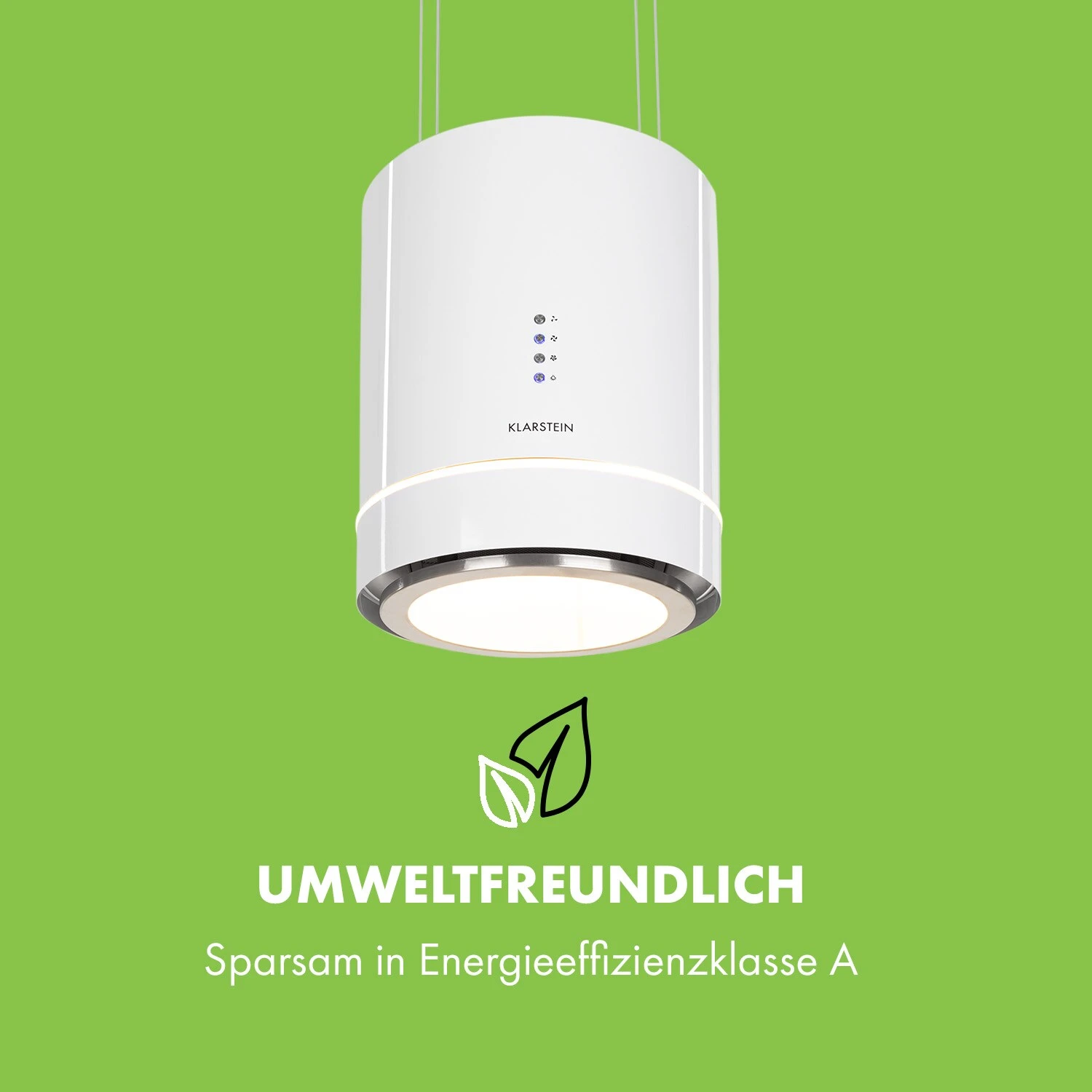 Klarstein Tron Ambience Dunstabzugshaube Deckenhaube Inselabzugshaube | 38 x 45 cm (ØxB) / 60 cm Abhängung | Umluftbetrieb in 3 Stufen | Umluftleistung: 540 m³/h | LED-Kochflächenbeleuchtung: 1 x 5 W | EEK A | weiß