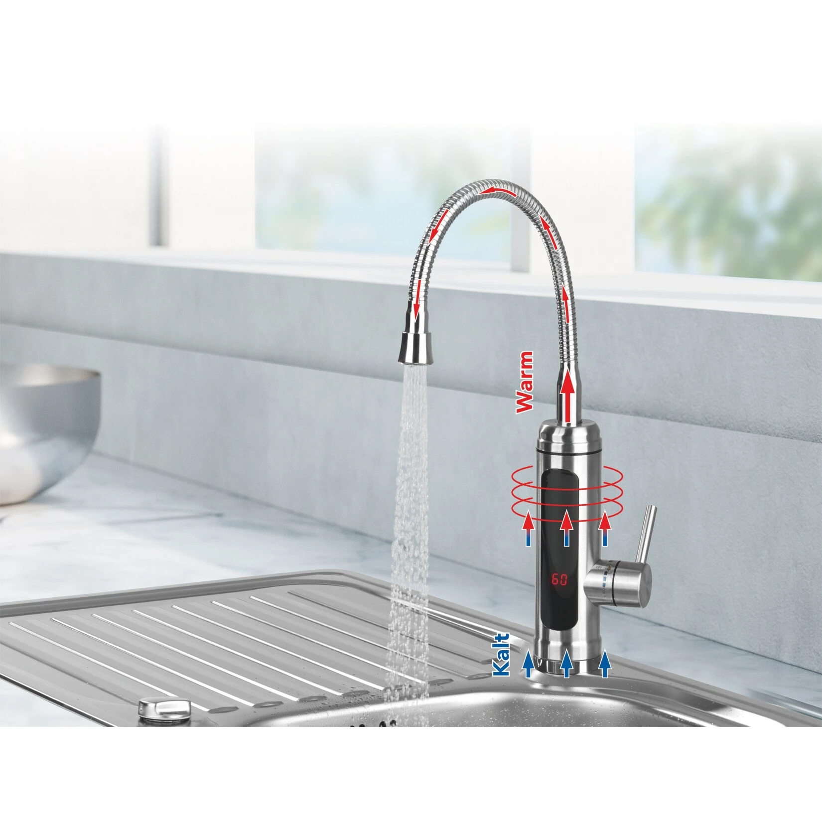 - Elektrische Waschtischarmatur mit integrierter, leistungsstarker Heizspirale
