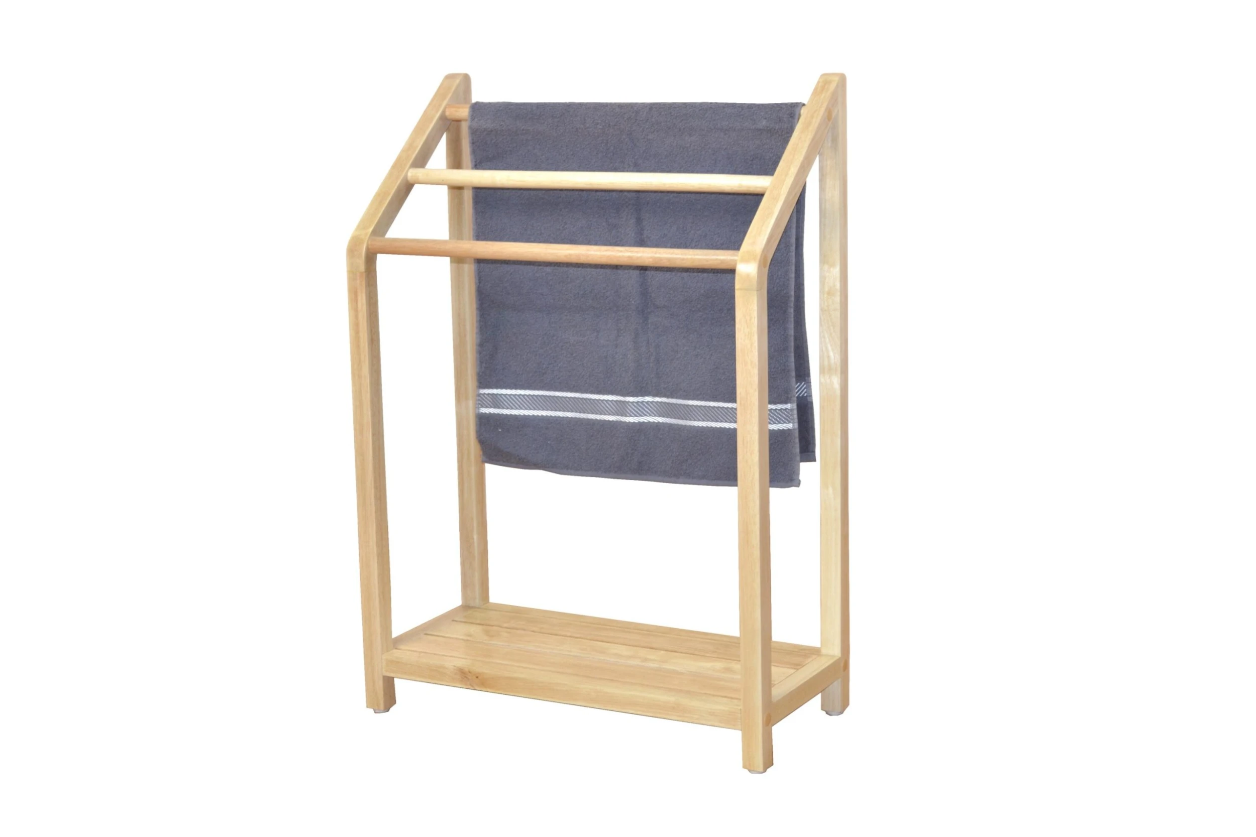 Handtuchhalter aus Massivholz Rubberwood mit einem Ablageboden und 3 festen Handtuch-Holzstangen. Die Oberfläche ist natufarben lackiert. Artikel wird zerlegt, mit Aufbauanleitung bei Ihnen im Paket angeliefert. Maße ca. cm: B. 61 x T. 29 x H. 68/87 cm