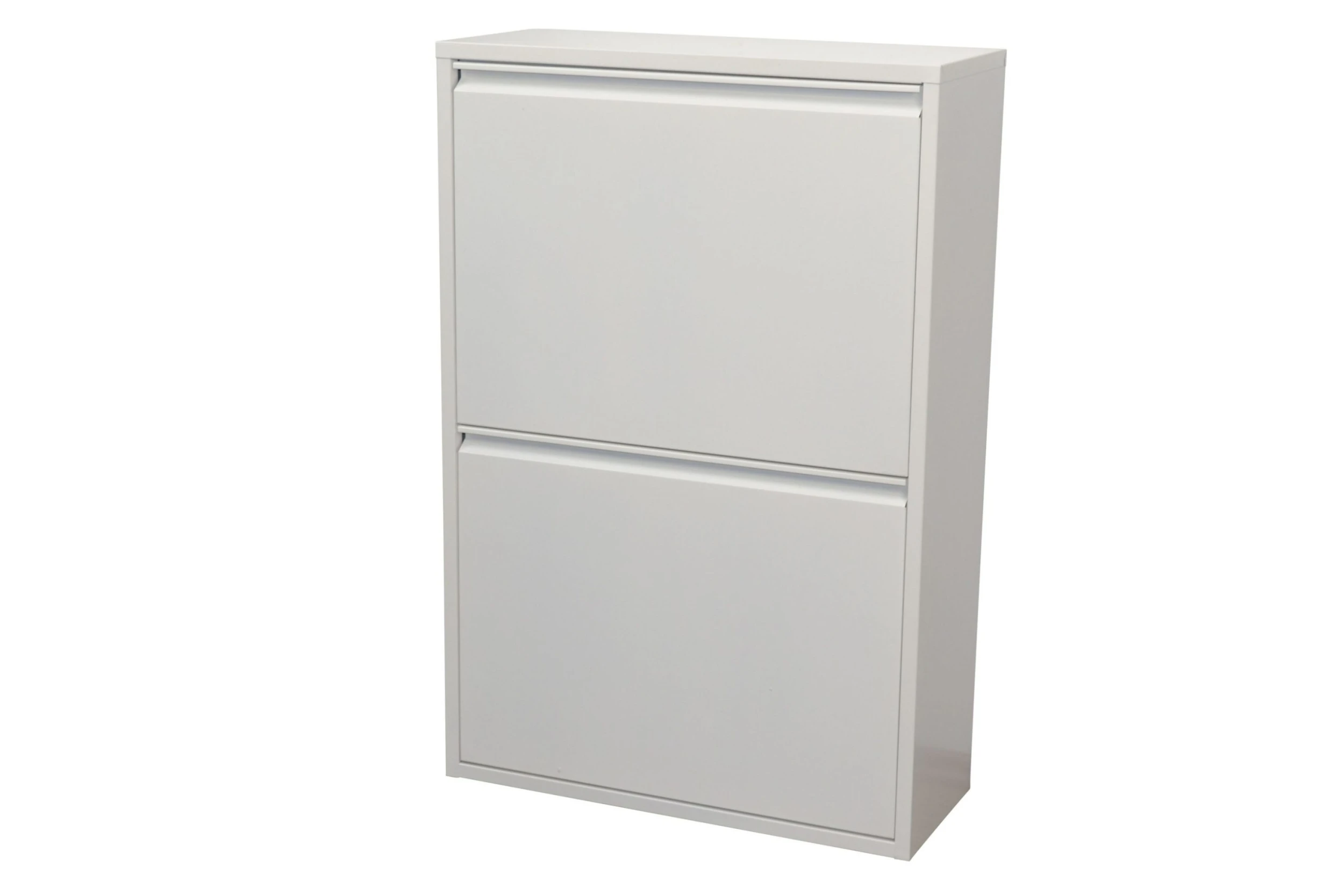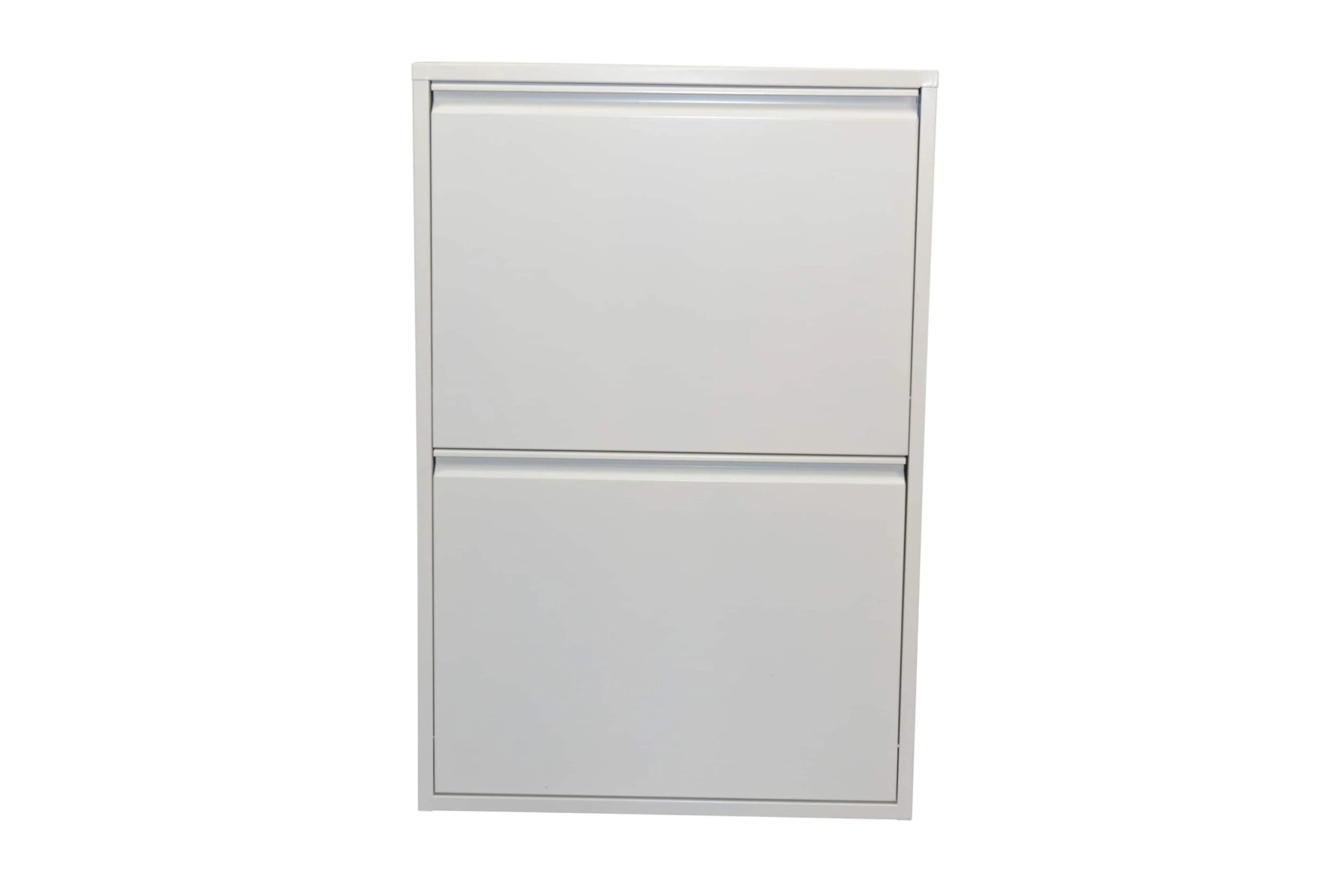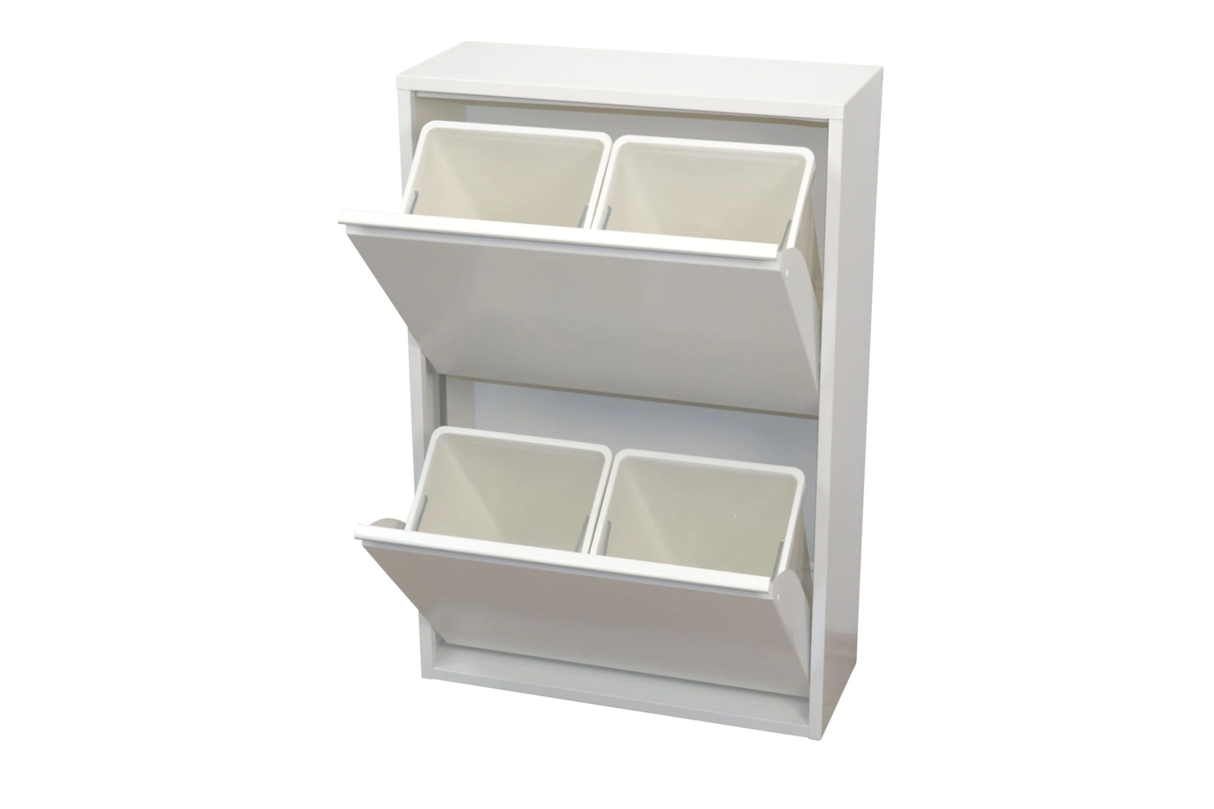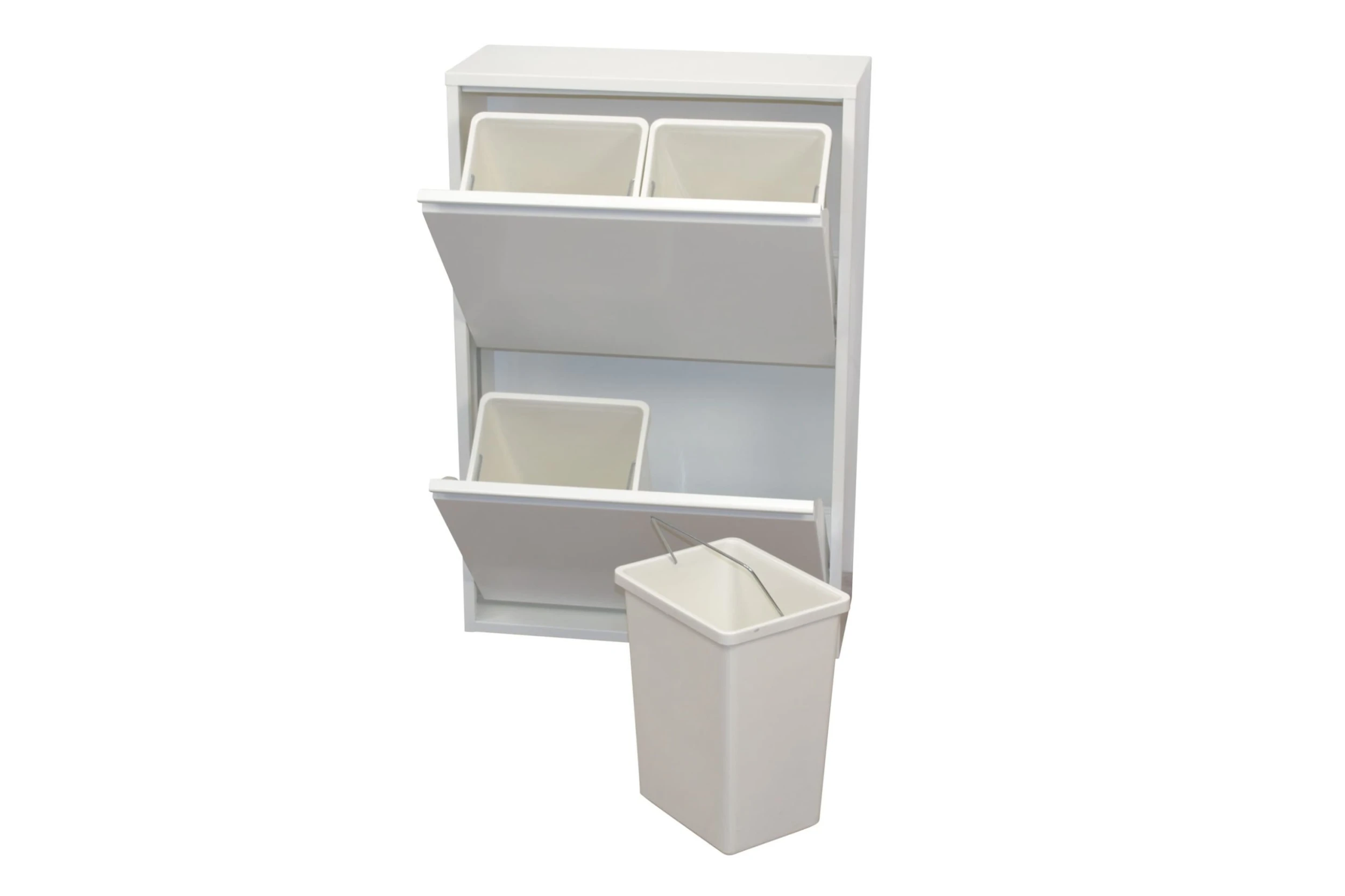 Mülltrenner mit 2 Klappen, dahinter je zwei herausnehmbare Kunststoffeimer. Korpus und Fronten aus Metall, uni weiß, beschichtet. Die zwei Klappen lassen sich auf einmal öffnen. Wandmontage erforderlich. Artikel wird montiert angeliefert. Maße ca. cm: (B/H/T) 62/93/25. Je Eimer 27/35/21,5 cm.