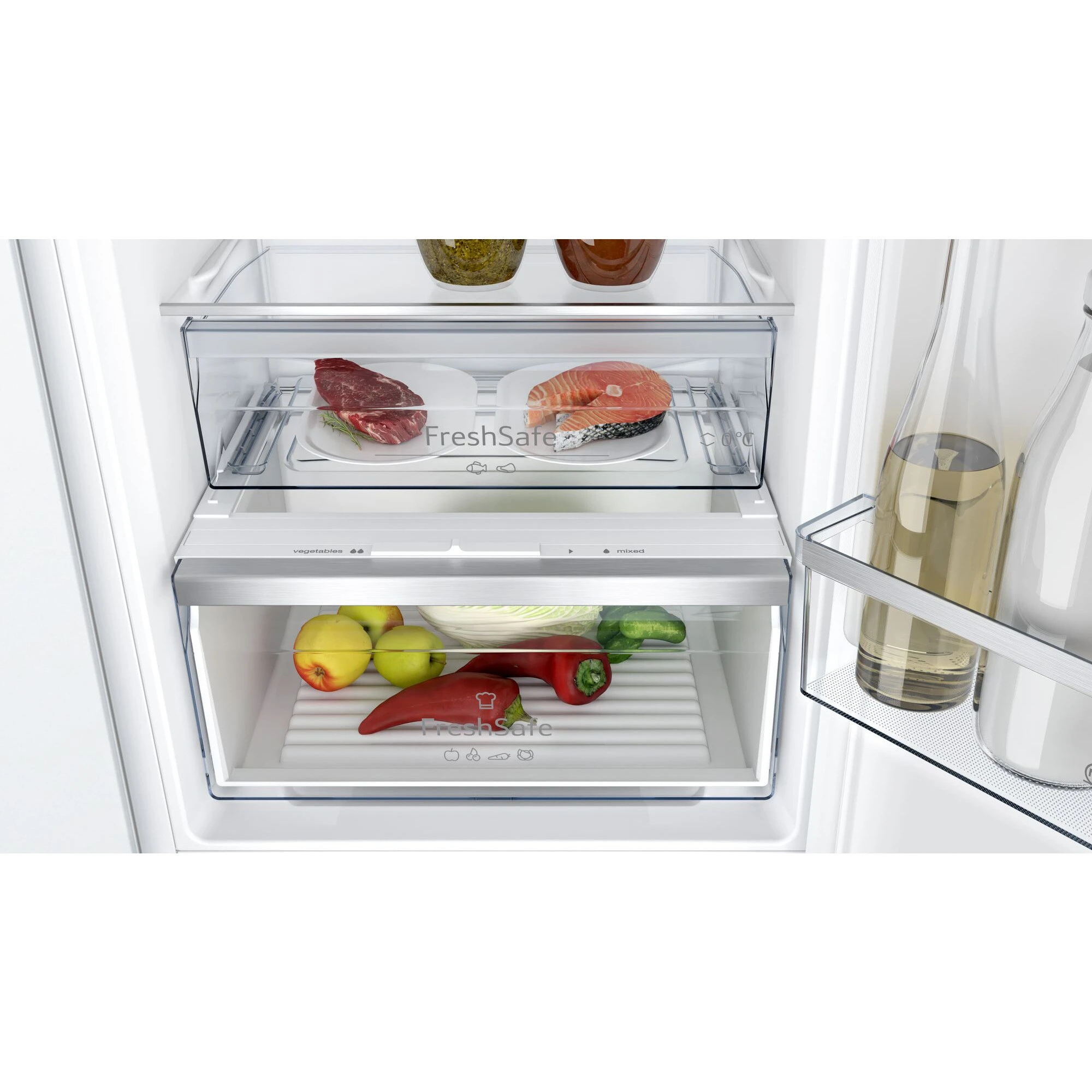- Fächer Kühlen – Weitere Fächer/Eigenschaften: Obst-/Gemüseschublade mit Feuchtigkeitsregelung; 1 FreshSafe 1 0°C Schublade