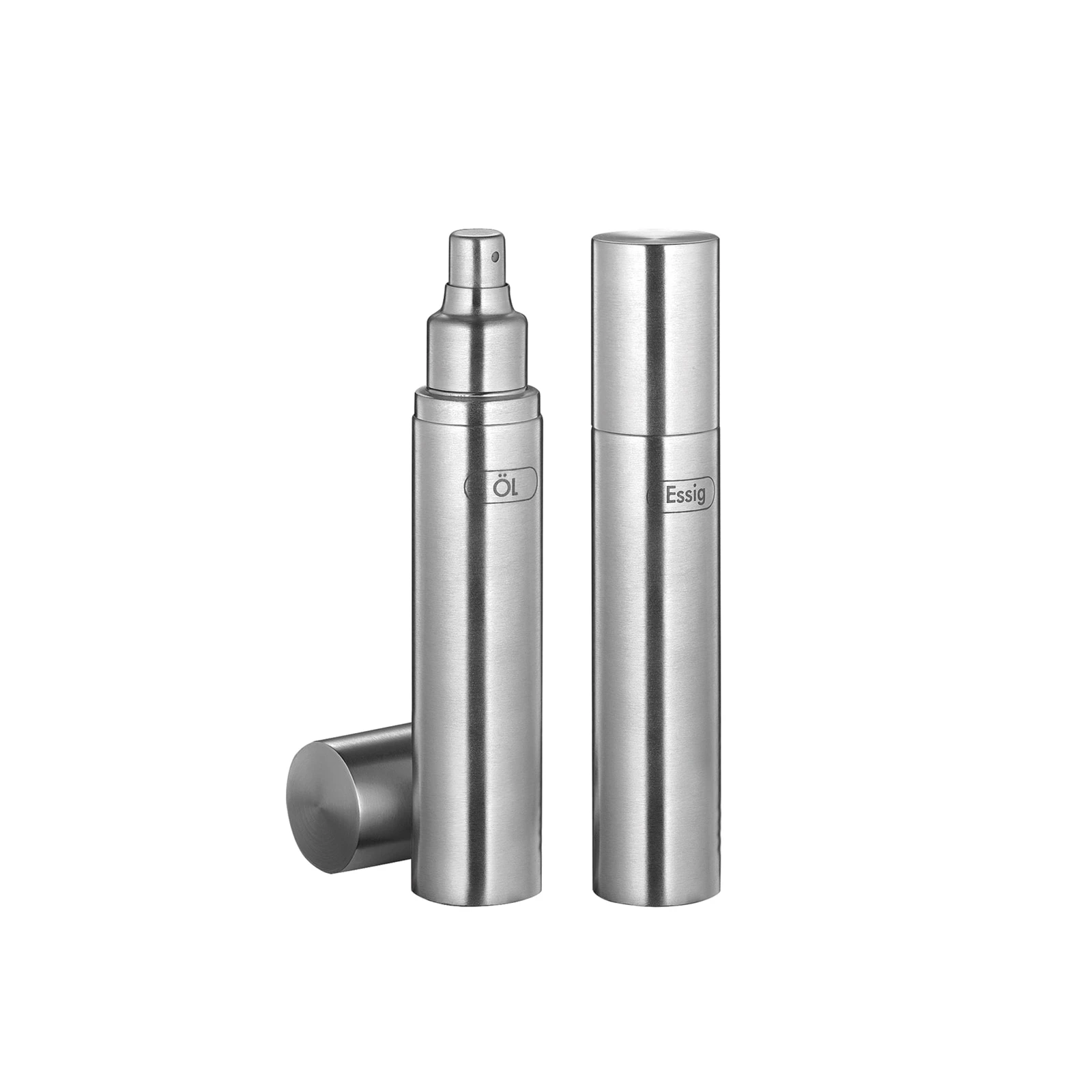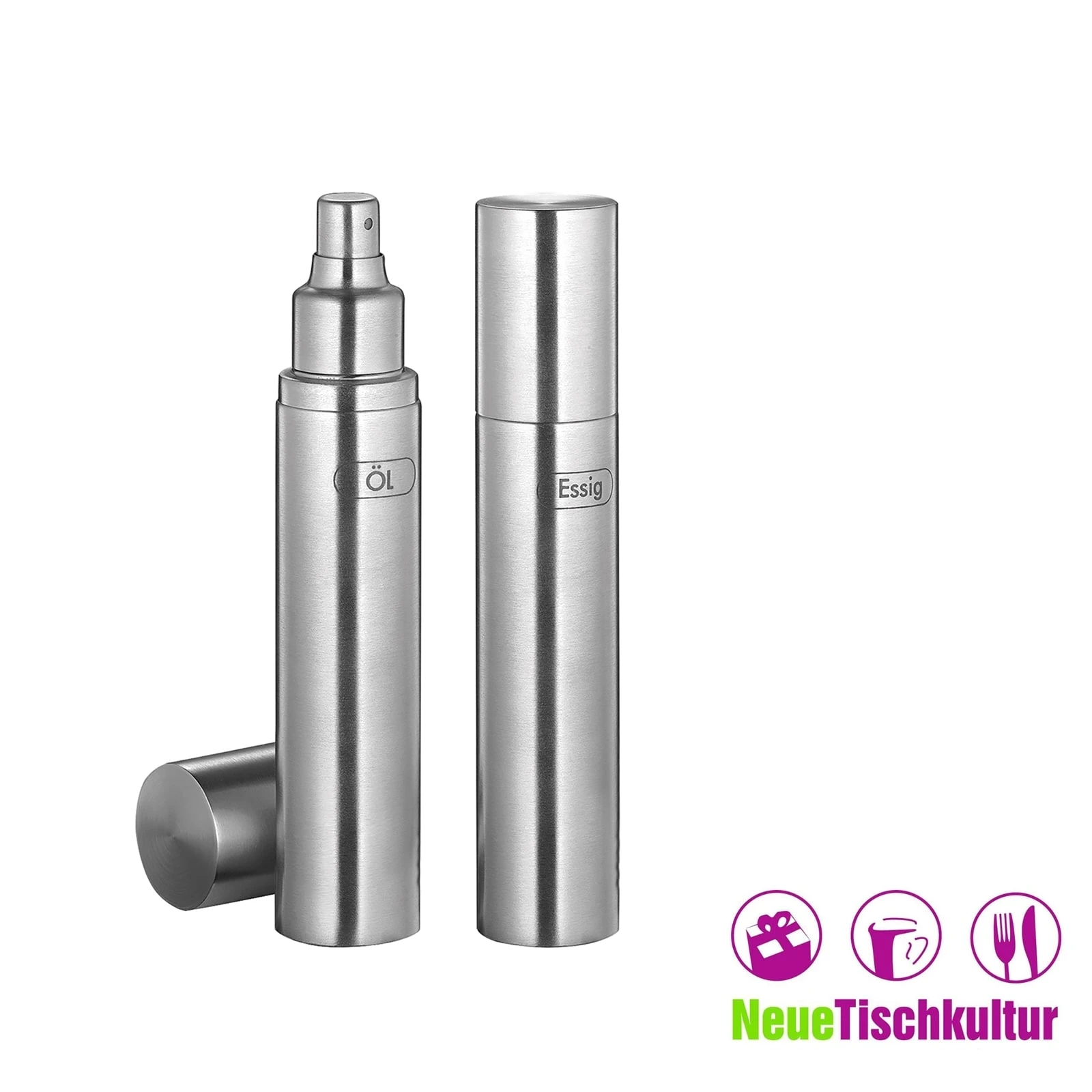 Der Essig-Sprüher TAVOLA liefert einen feinen Sprühnebel. Auch praktisch, wenn Sie Linsensuppe mit Aceto Balsamico abschmecken möchten. Für die Feinabstimmung sorgt ebenfalls der Öl-Spender TAVOLA. Er aromatisiert auf Knopfdruck Salat, Pasta oder Fisch. Zum Einsprühen Ihrer Bleche können Sie den Öl-Spender natürlich auch benutzen. Und falls sie mal nicht im Einsatz sind, sehen die schlanken Sprüher aus mattiertem Edelstahl einfach gut aus. Maße: Ø 3,8 cm Höhe 19,1 cm