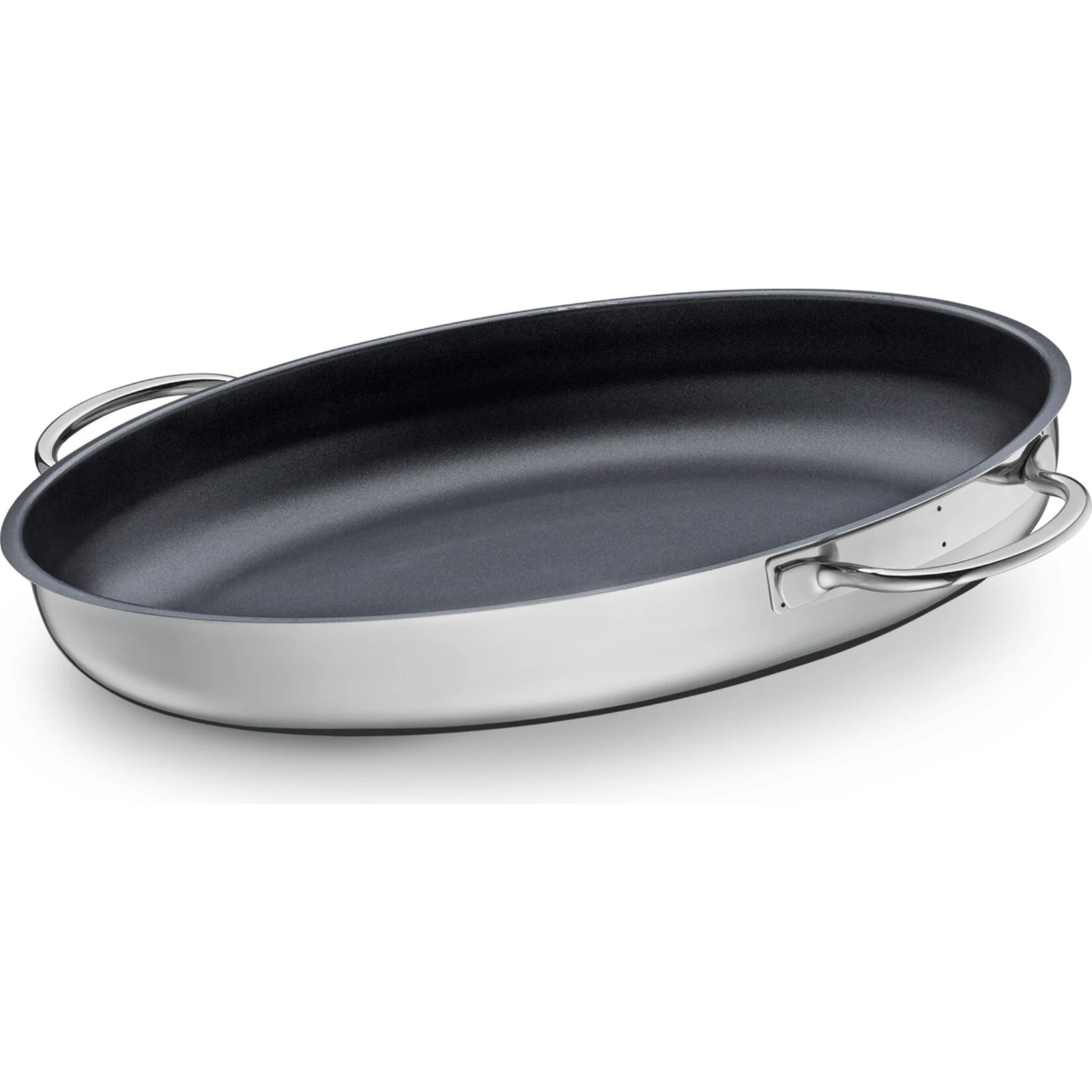 Die flache Fischpfanne verhindert durch die hochwertige Antihaftbeschichtung , dass Kabeljau, Lachs Co. wegen ihres hohen Eiweißgehalts am Pfannenboden kleben bleiben. Die ovale Form bietet genügend Platz für ganze Fische oder für eine mediterrane Reispfanne mit Meeresfrüchten. Auch Fleisch- oder Gemüsespieße gelingen perfekt. Dafür sorgt der extra starke Mehrschichtboden, der die Hitze gleichmäßig verteilt. Die Pfanne ist für alle Herdarten inklusive Induktion geeignet und darf sogar in den Backofen. Maße: L/B/H 39 x 27 x 6 cm, für 3,9 L, Gew. 1,68 Kg