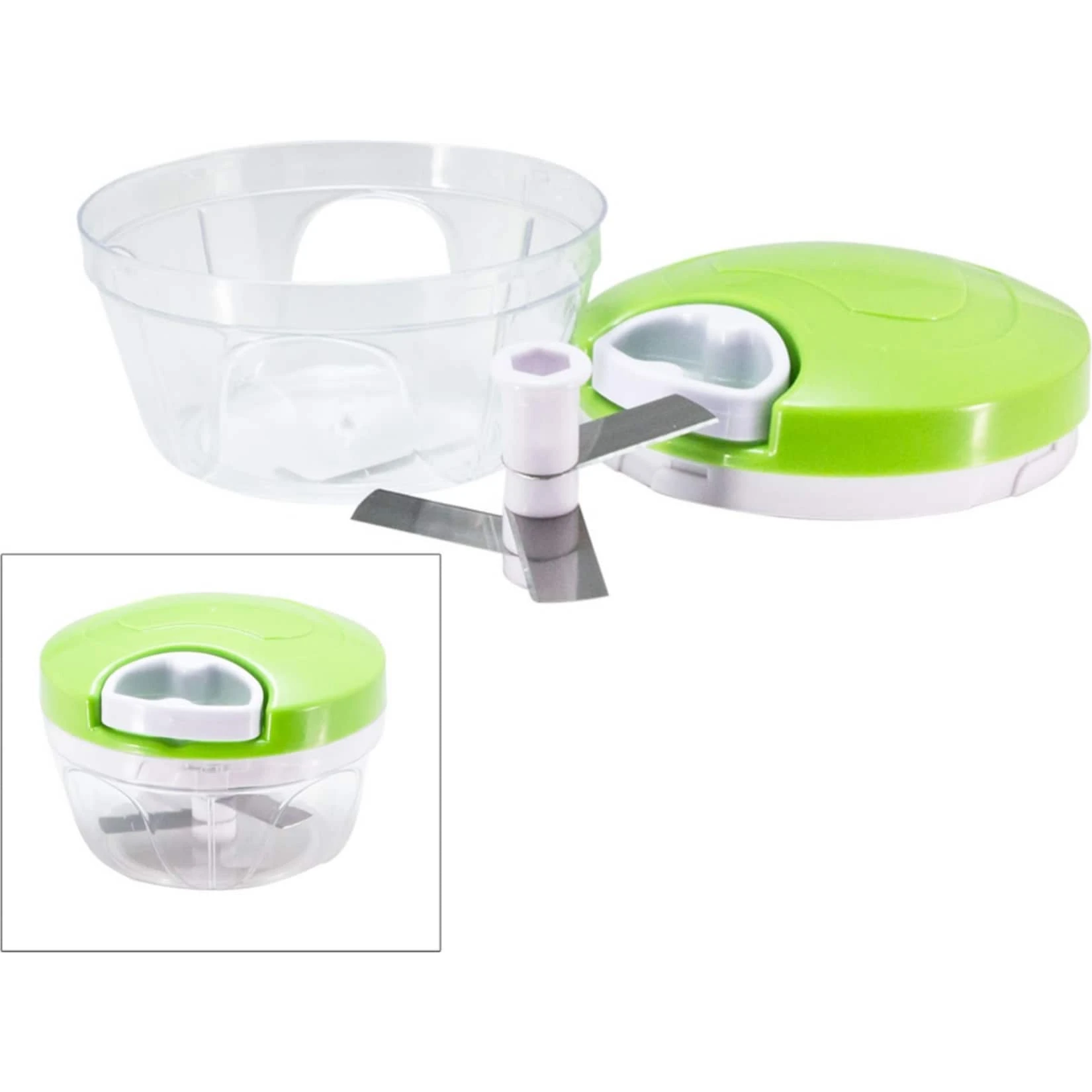 Dieser praktische Helfer darf in keiner Küche fehlen. Ideal zum Zerkleinern von Gemüse, Obst, Zwiebeln und Kräutern. Maße gesamt Ø 12,5 x 9 cm, Maße je Messerklinge 5 x 1,8 cm, Volumen ca. 400 ml