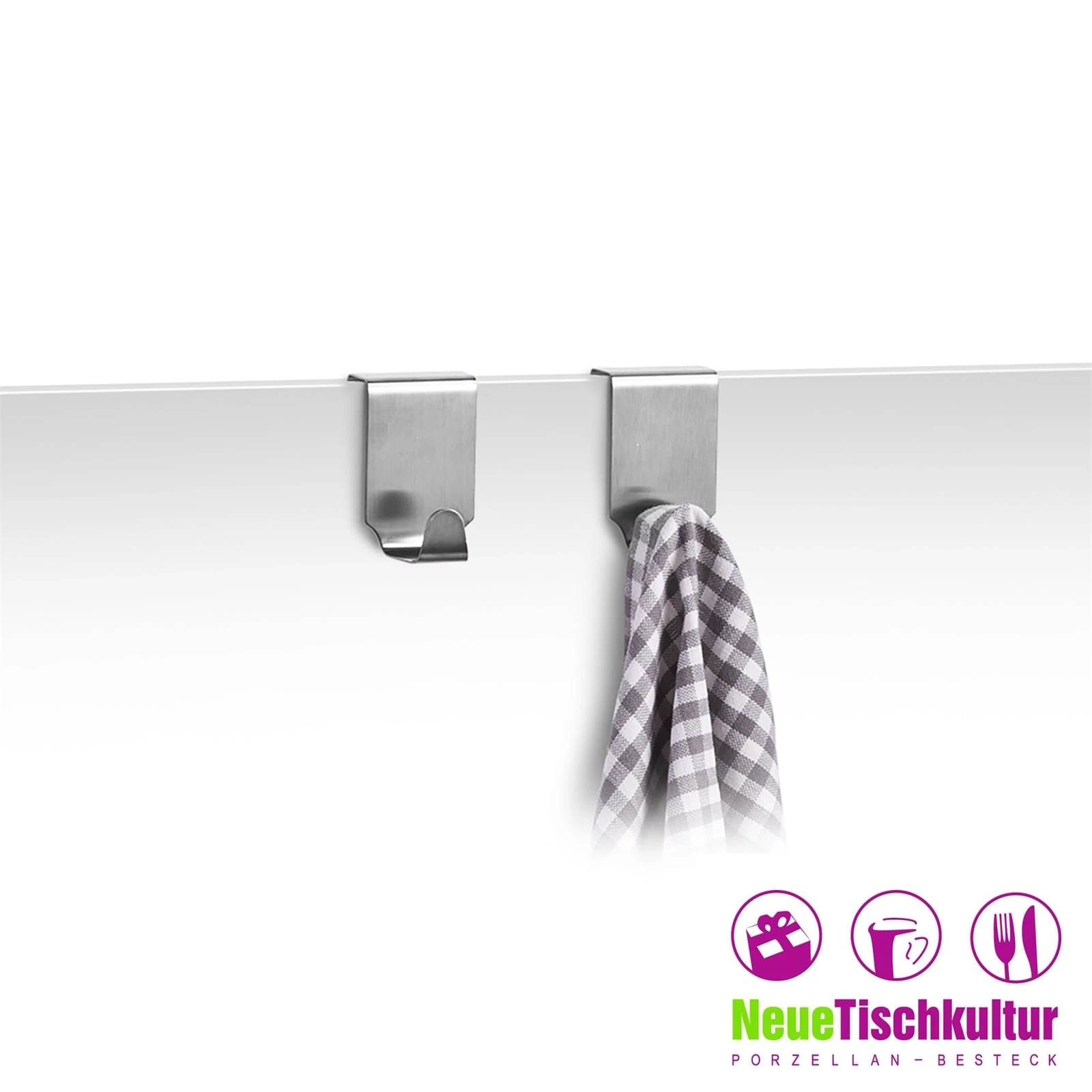 Solche praktischen Haken dürfen in keiner Küche fehlen: einfach einzuhängen sind sie flexibel platzierbar und halten Geschirr- und Handtücher. Haken aus Edelstahl im 2er-Set, Maße je 4 x 5 x 6 cm