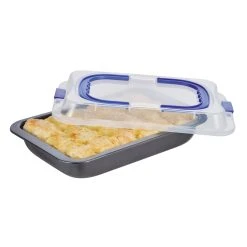 Backen, Aufbewahren und Transportieren in Einem – die Kuchenform aus Metall mit Kunststoffdeckel macht es möglich. Die eckige Form ist ideal zum Backen von leckeren Blechkuchen. Der fertige Kuchen kann dann ohne umlagern in der Form mit Deckel im Kühl- oder Gefrierschrank aufbewahrt und dank Tragegriffen problemlos transportiert werden.