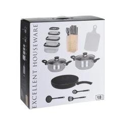 - Lieferumfang: im Set enthalten sind Töpfe, Vorratsbehälter, Schneidebrett, Pfannenwender, Messerblock, Schere – siehe Beschreibung