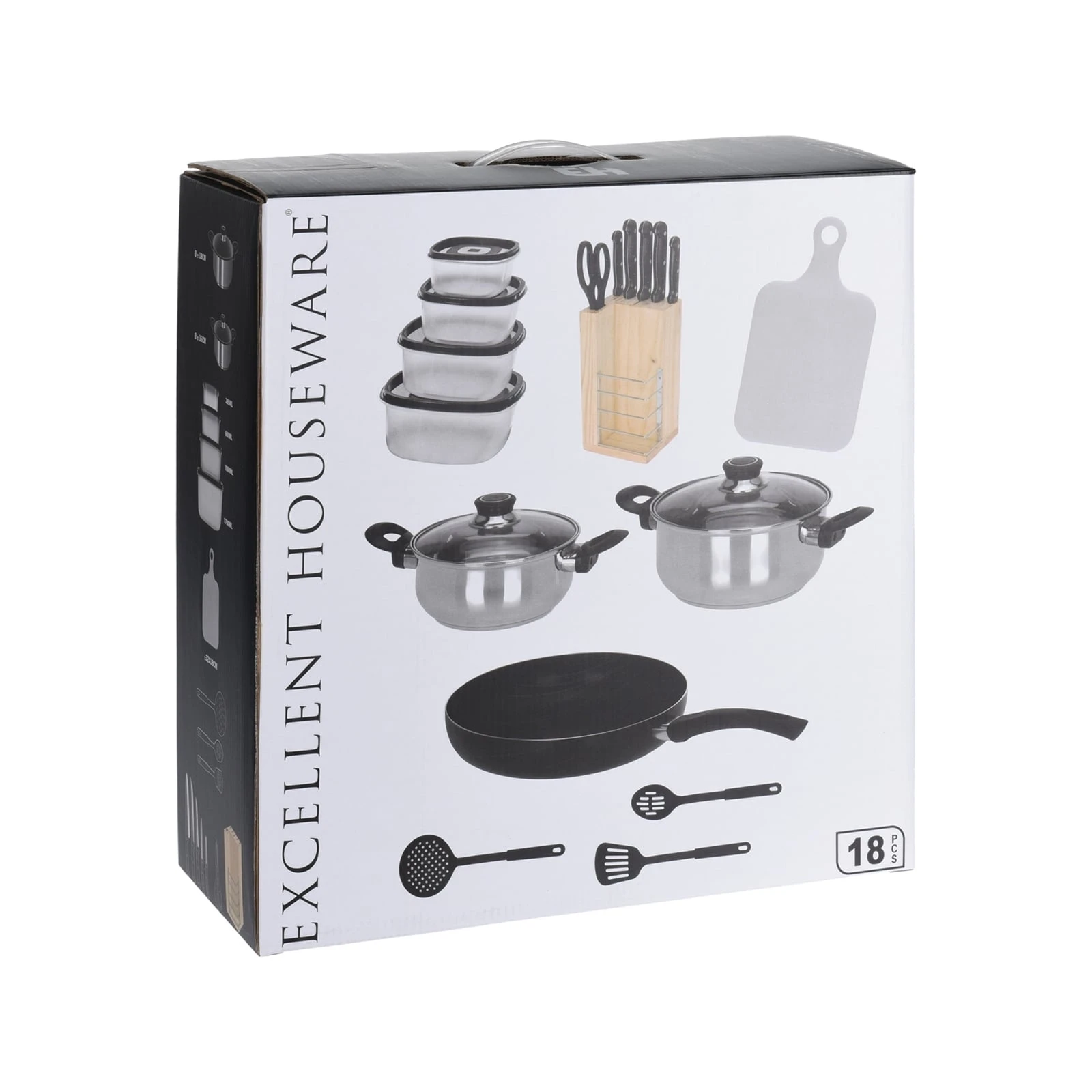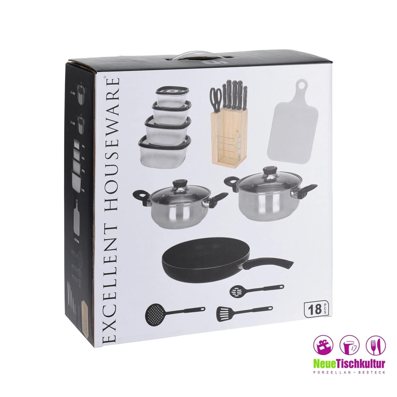 Ein tolles Starterset für jeden Küchenanfänger. So macht Kochen Spaß! Küchen-Set 17 Teilig bestehend aus: Kochtopf 18 cm Kochtopf 16 cm Bratpfanne 24 cm Vorratsbehälter 500 ml Vorratsbehälter 1 Liter Vorratsbehälter 2 Liter Schneidebrett 32 x 18 cm 3 Pfannenwender Küchenblock mit 5 Messern 1 Schere