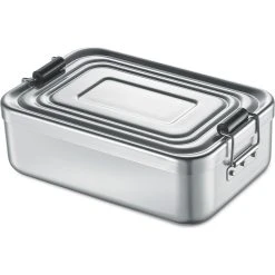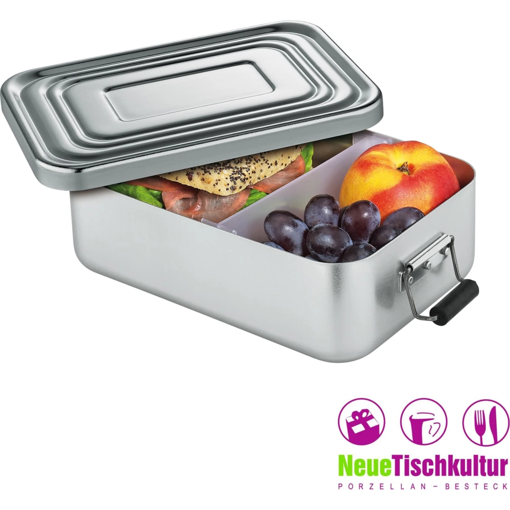 Sie können die Box schon am Vorabend befüllen. Die Verschlüsse halten dicht, da kullert nichts durch die Tasche. Der Trennsteg hält von innen Ordnung, d.h. Sie haben zwei Fächer. Bei drei Farben zur Auswahl sind Verwechslungen ausgeschlossen. Offen für Neues? Dann lassen Sie sich doch mal von Ihrem Liebsten oder dem Nachwuchs eine Überraschungs-Box packen. In dem Aluminium bleibt der Inhalt lange kühlschrankfrisch. Der Deckel hat eine Silikondichtung, die alles schön dicht hält. Maße: L/B/H 18 x 12 x 5,5 cm