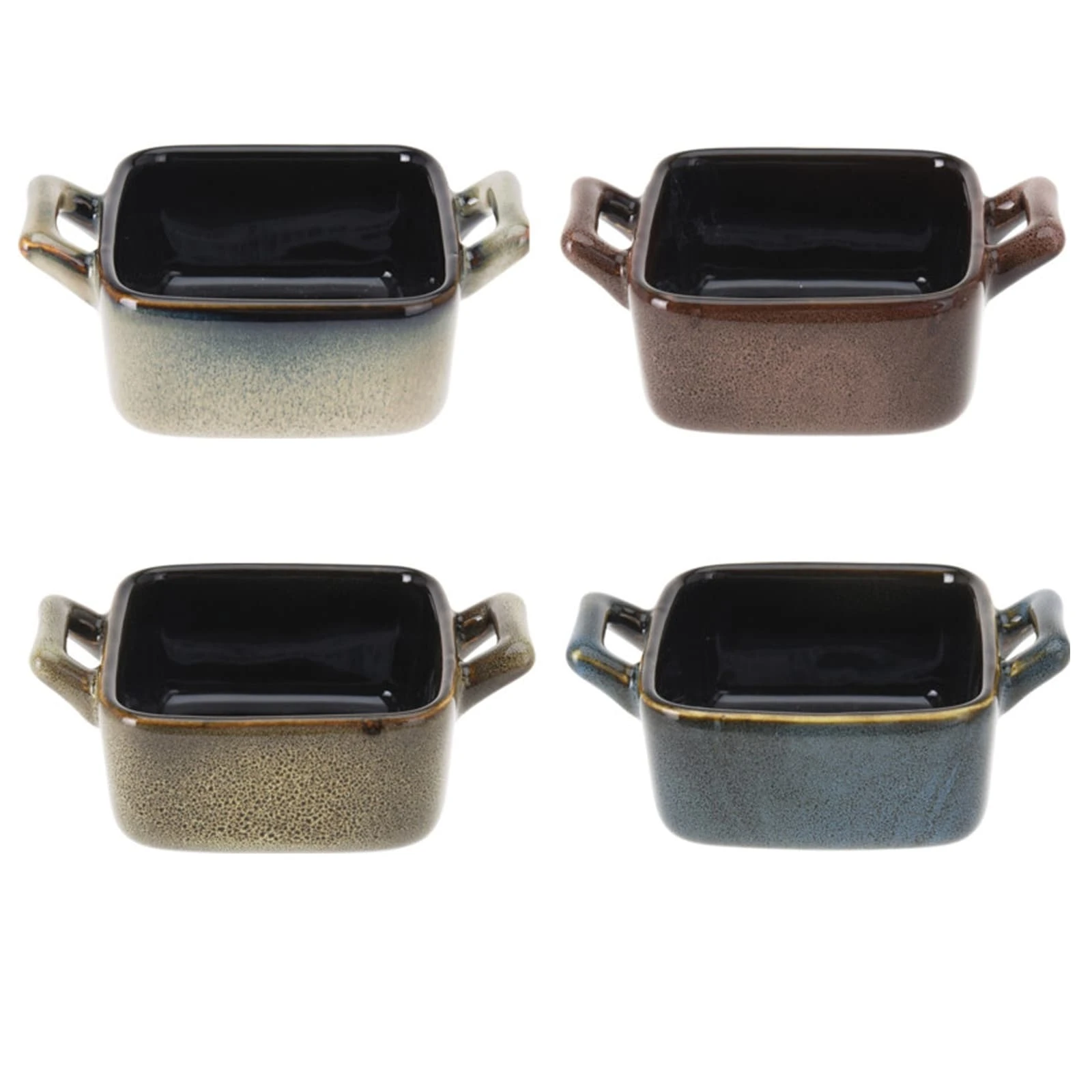 Langlebig, solide und aus hitzebeständigen Materialien hergestellt- solche Schalen und Schälchen werden in jeder Küche als Backformen oder Auflauffom benötigt. Ragout fin, überbackene Zwiebelsuppe oder vielleicht Auflauf? In einer Auflaufform bereiten Sie ganz einfach Ihre Lieblingsgerichte zu. Das Schälchen ist farblich sortiert. Es werden pro ausgewählter Größe jeweils 4 Stück geliefert (Farben sind nicht frei wählbar). Die Schale gibt es in zwei Größen. . Gesamtmaß mit Henkel: klein 10 x 7 x 4 xm (Länge ohne Henkel 7 cm), groß 19 x 11 x 5 cm (Länge ohne Henkel 14 cm)
