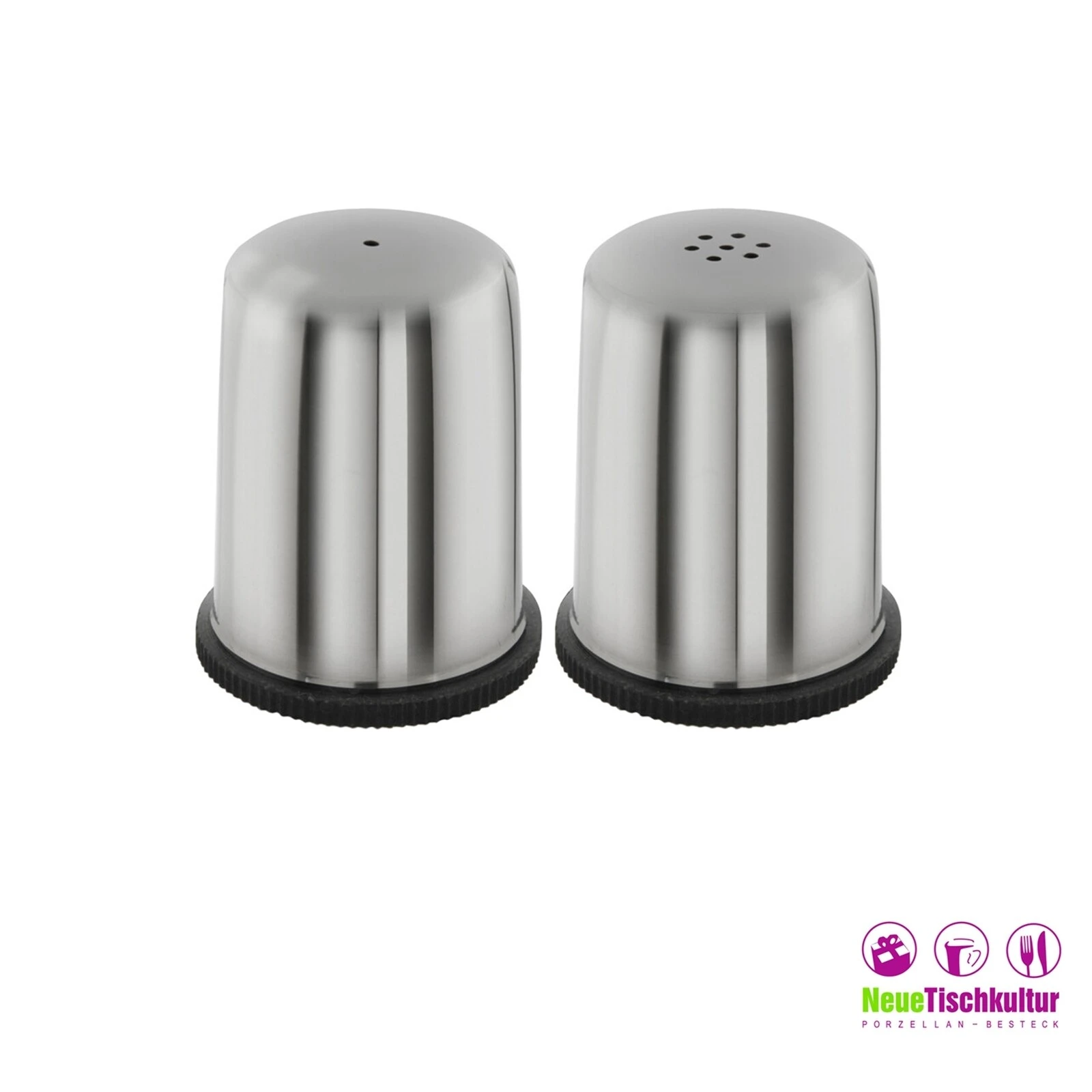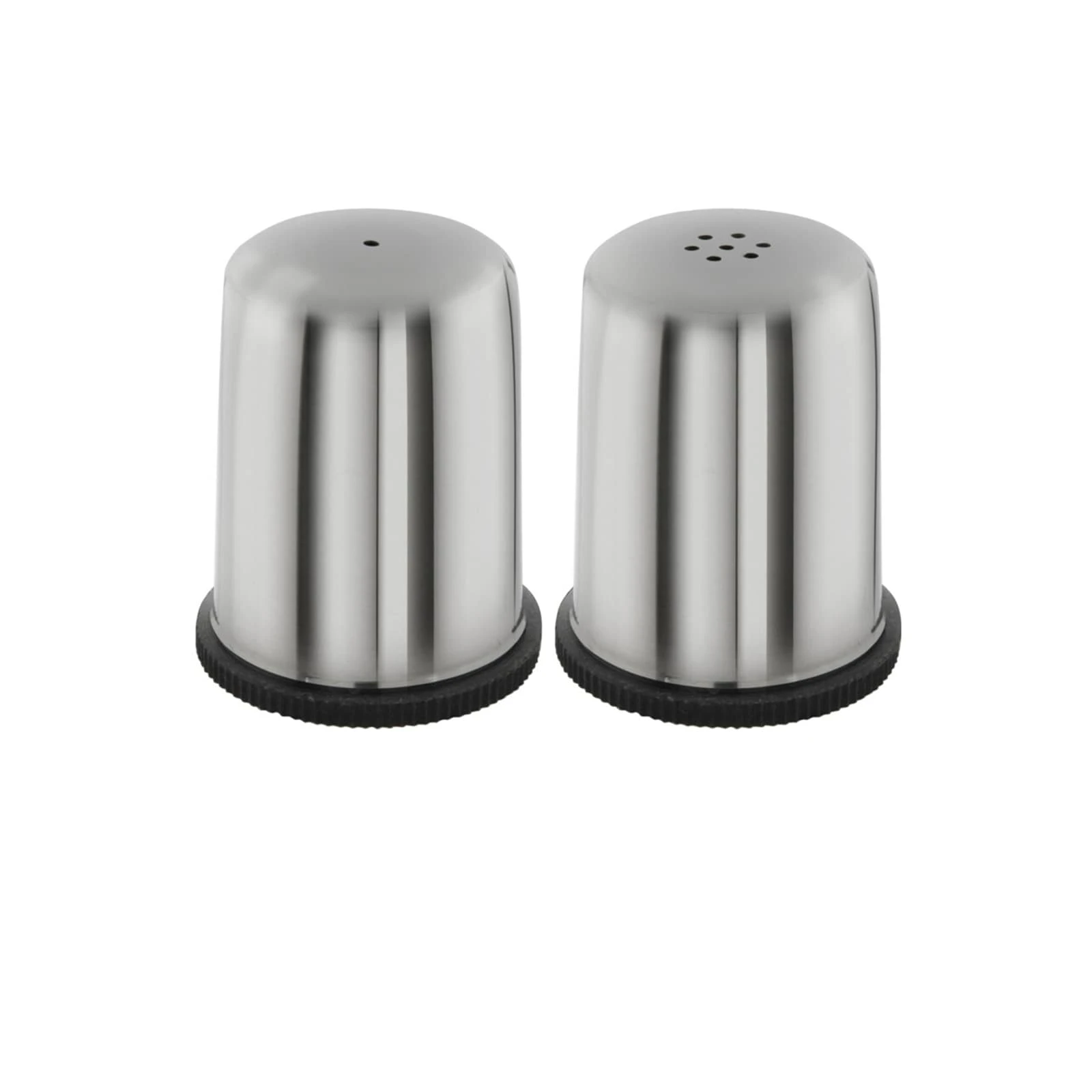 Salz- und Pfefferstreuer aus Edelstahl auf Halterung aus Gummi. Material: Edelstahl, Größe eines Teils: Ø 4,5 cm H 5,5 cm