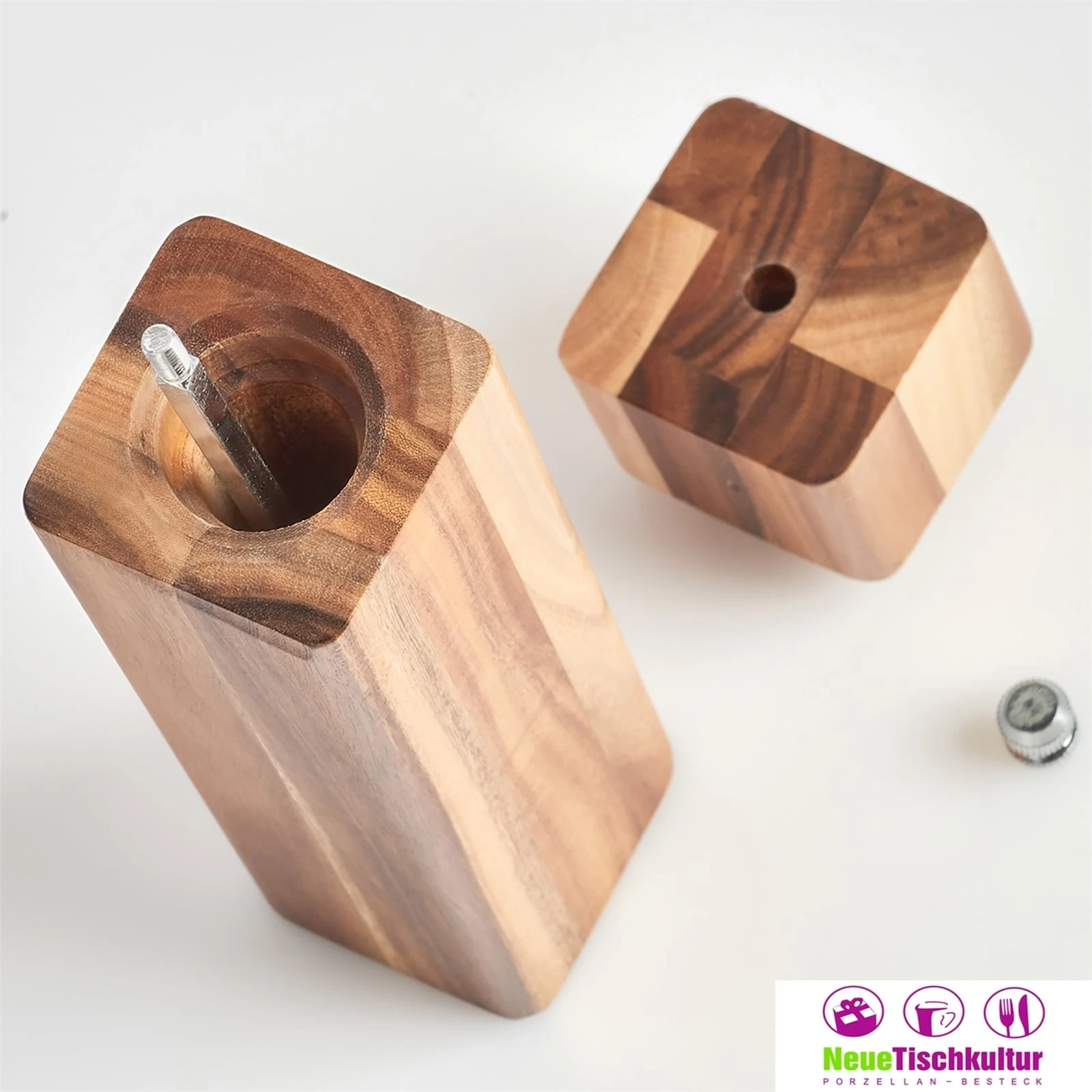 Diese hochwertige Gewürzmühle kann man als Pfeffer- sowie Sallzmühle verwenden. Die Mühle besteht aus Akazienholz. Akazienholz gilt als eine der widerstandsfähigsten Holzarten weltweit. Darüber hinaus ist das Holz für seine elegante Maserung bekannt, die durch die individuellen hellen und dunklen Farbtöne einen effektvollen Kontrast entstehen lässt. Die kleine Salz- und Pfeffermühle besitzt ein quadratisches Format mit abgerundeten Kanten, sodass das Mahlen von Körnern leicht und schnell gelingt. Zum Nachfüllen muss die Schraube am Kopf aufgedreht werden. Die Mühle gibt es in zwei Größen.