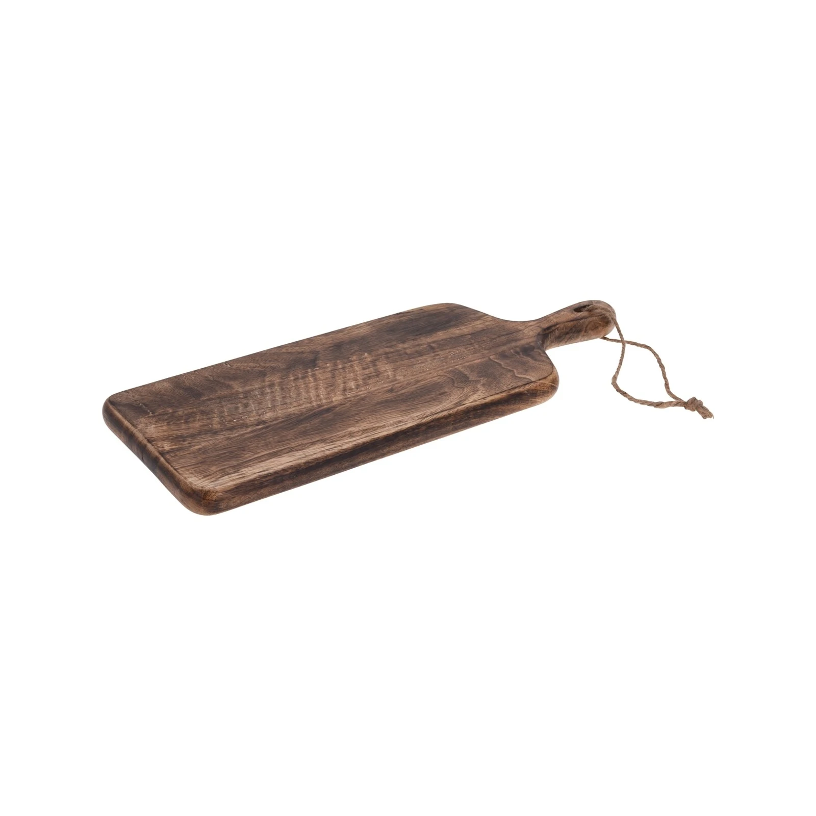Schneidebrett eckig, was als Schneidebrett oder als Servierbrett verwendet werden kann. Das Brett gibt es in 3 Größen: Maße in cm L/B/H kleines Brett 25 x 14,5 x 1,5 cm, mittleres Brett 40 x 15 x 2 cm, großes Brett 60 x 24,5 x 2 cm. Das Brett ist rustikal gestaltet und hat am Griffloch einen Strick, an dem man es anhängen könnte.