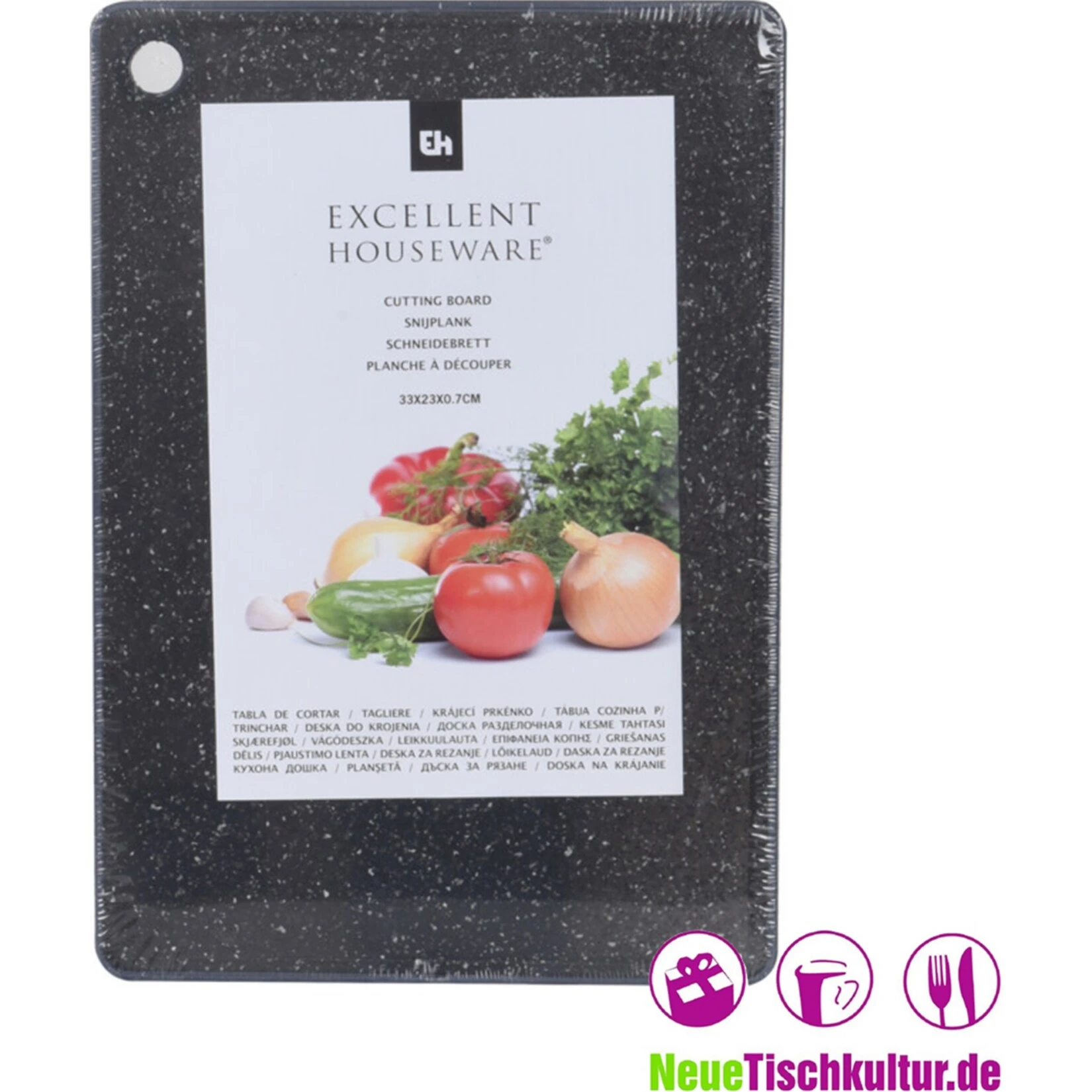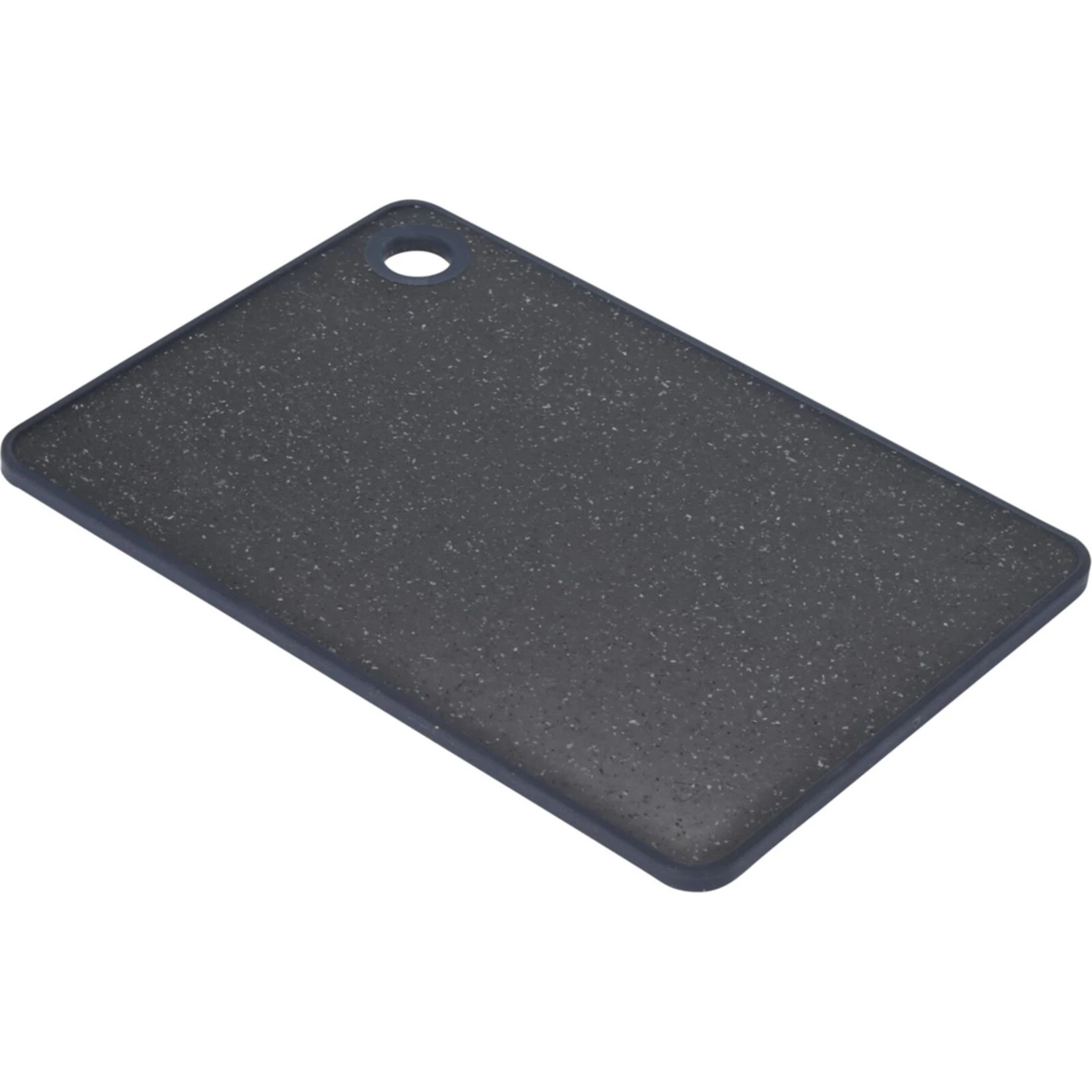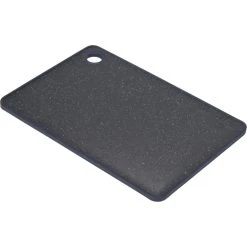 Ein klassisches Schneidebrett aus marmoriertem Kunststoff, welches eine Aussparung hat, um es eventuell aufzuhängen. Ein stabiles und praktisches Schneidbrett, was man täglich in der Küche braucht.