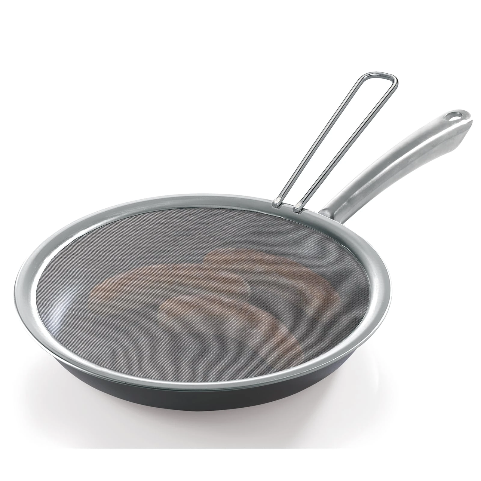 Hm, das Steak brutzelt in der Pfanne und duftet köstlich! Weniger appetitlich sind die Fettspritzer am Herd und auf den Kacheln. Das Spritz-schutzsieb von KÜCHENPROFI schafft Abhilfe. Die feinen Maschen halten die Spritzer zurück, der Dampf entweicht – für ein perfektes Brater-gebnis. Der breite, leicht gewölbte Rand des Siebs sitzt gut auf Töpfen und Pfannen, der stabile Griff gibt zusätzliche Sicherheit und wird nicht heiß. Zur Reinigung stecken Sie das in zwei Größen (Ø 30 cm/33cm) erhältliche Sieb aus robustem Edelstahl einfach in die Spülmaschine.