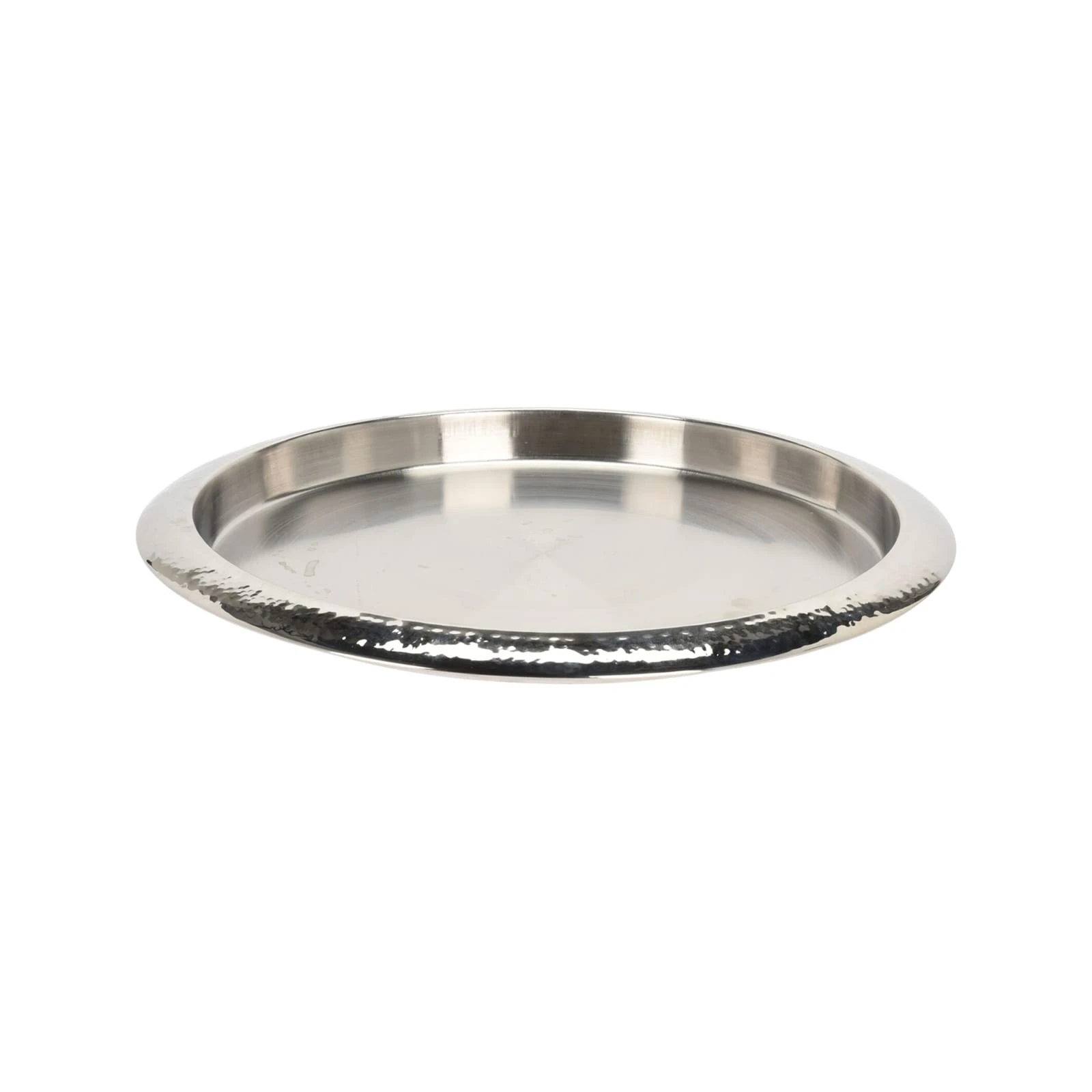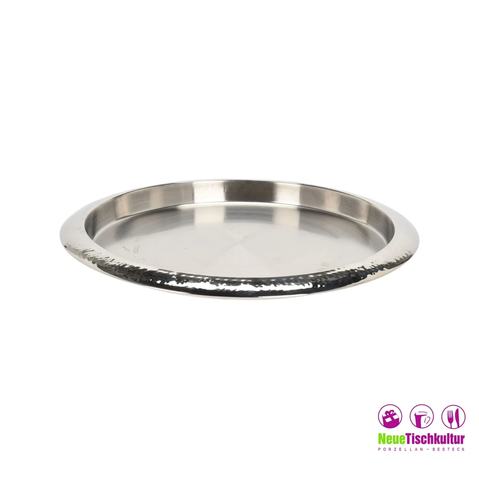 Sehr schönes klassisches Tablett in silber aus Edelstahl. Maße: Ø 35 cm. Wiegt nur leichte 350 Gramm.
