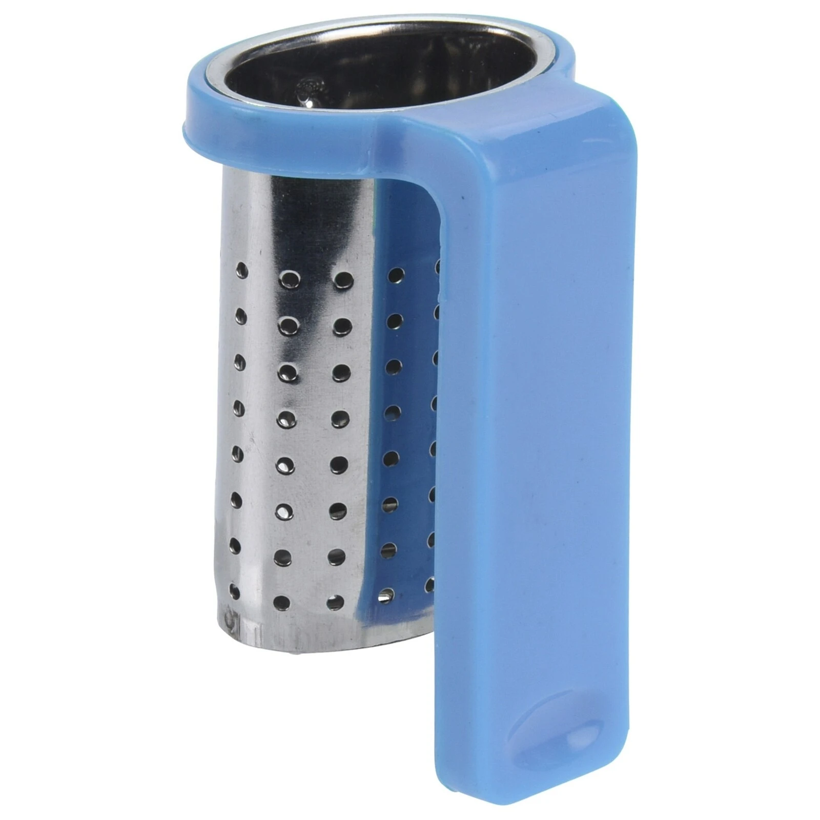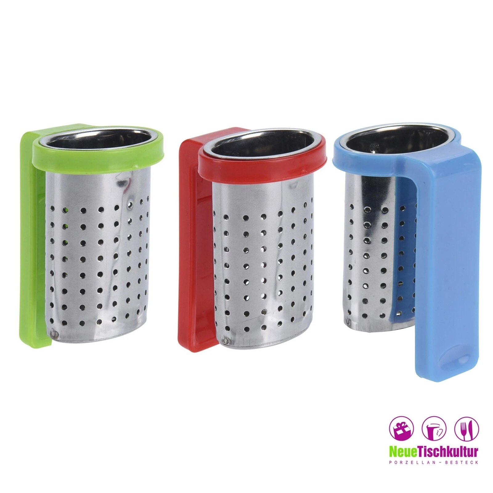 Teesieb aus Edelstahl mit Kunststoff-Griff zum Einhängen in die Kanne oder in den Becher. Den Griff gibt es in Blau, Rot oder Grün. Die Farbwahl ist hier leider nicht möglich, wir liefern mit dem Zufallsprinzip. Maße: L/B/H 4 x 2,5 x 6 cm