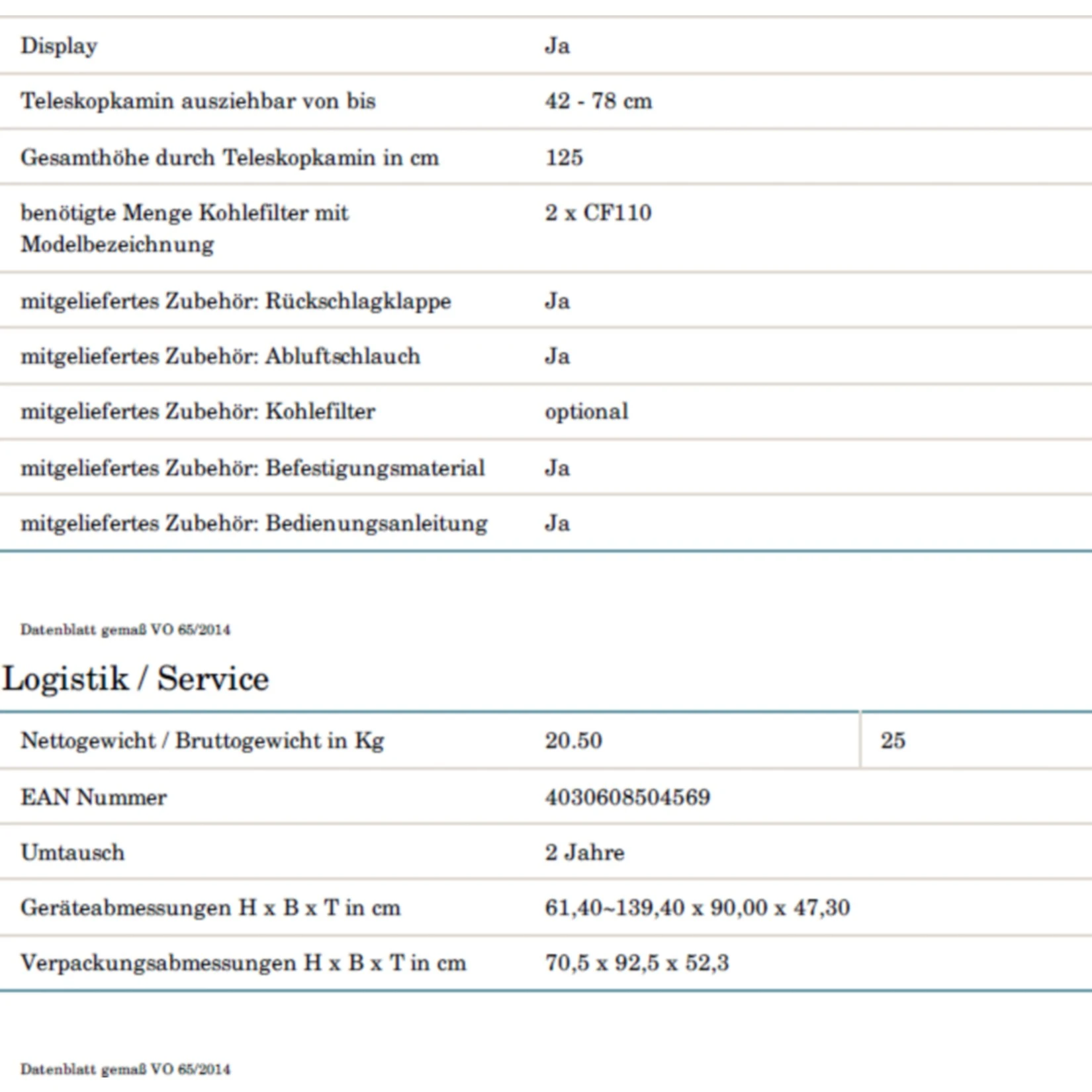 Gesamthöhe durch Teleskopkamin 125,00 cm
