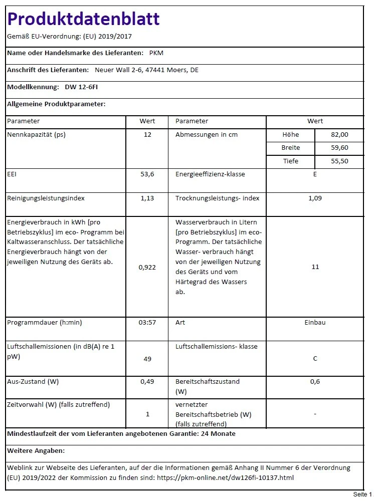 Diese Geschirrspülmaschine von PKM lässt keine Wünsche offen. Sie kann voll in Ihre Küche integriert und mittels einer Blende optisch perfekt angepasst werden. Die Spülmaschine verfügt über ein Fassungsvermögen von 12 Gedecken und ein Aquastopp System. Die Bedienung erfolgt über den oberen Rand der Türe, darin sind die Bedienknöpfe eingelassen. Startzeitvorwahl, viele Spülprogramme und weiter technische Highlights überzeugen auf ganzer Linie.