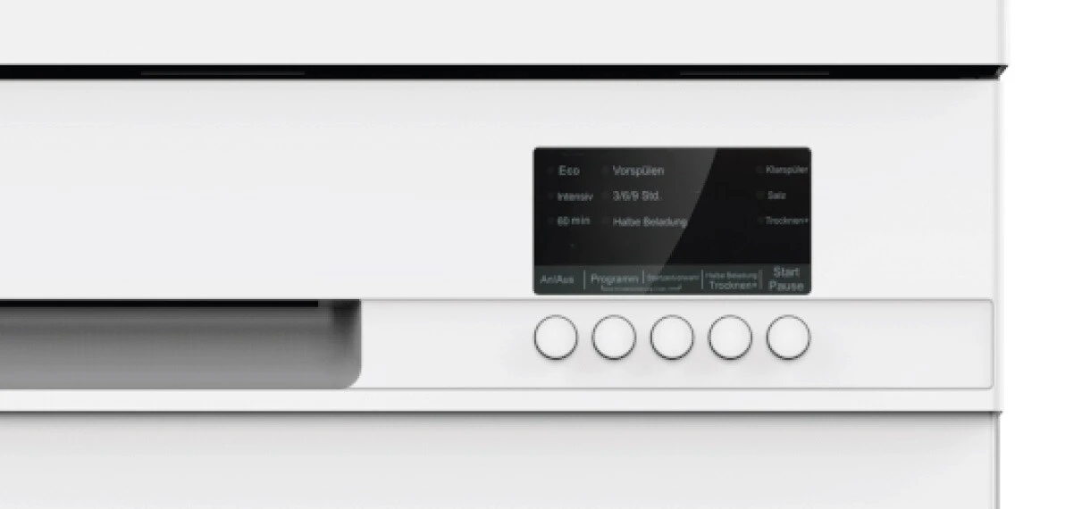 - 5 Programme (Intensiv, ECO, 60 Min., Vorspülen, halbe Beladung)