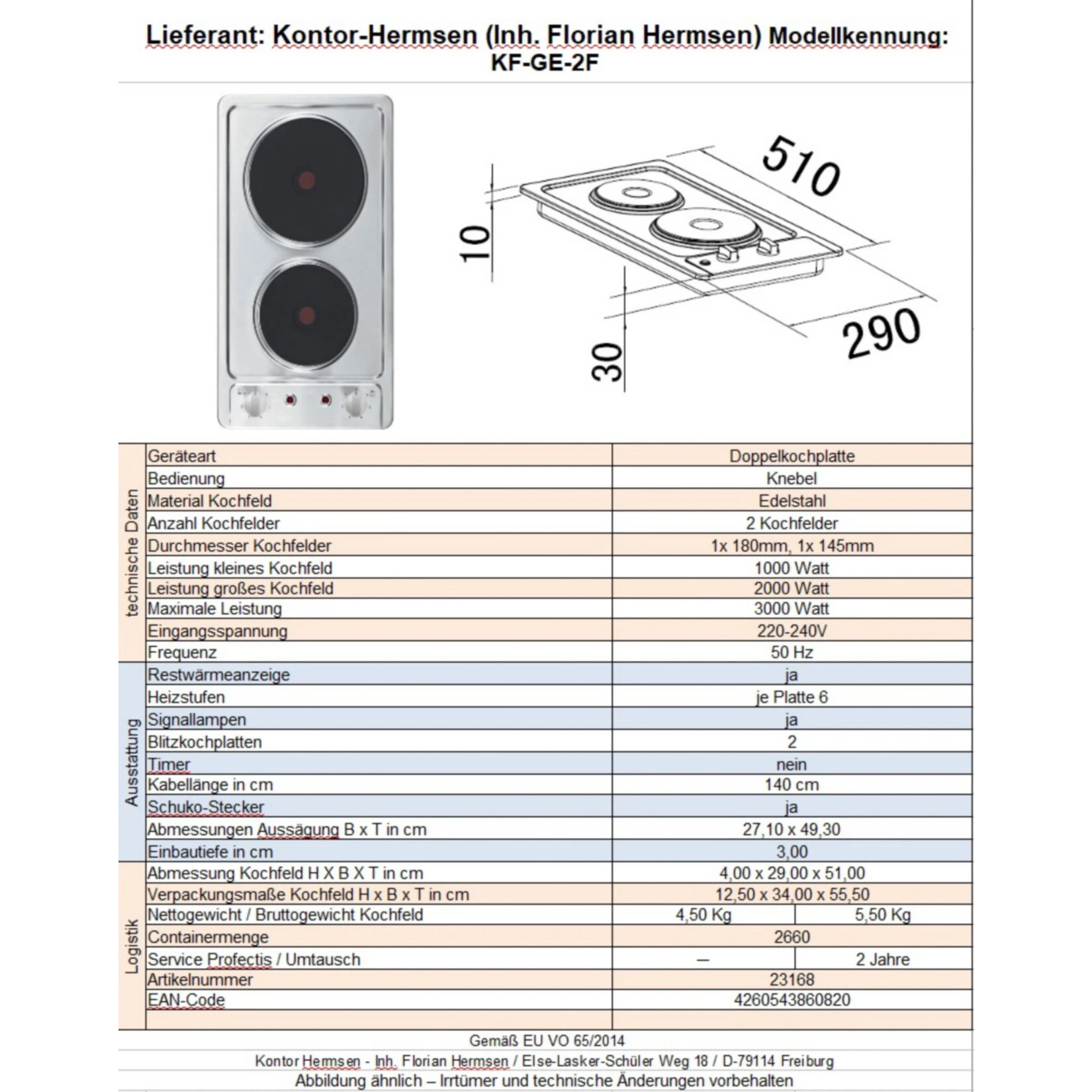 Abmessung Kochfeld H X B X T in cm: 4,00 x 29,00 x 51,00