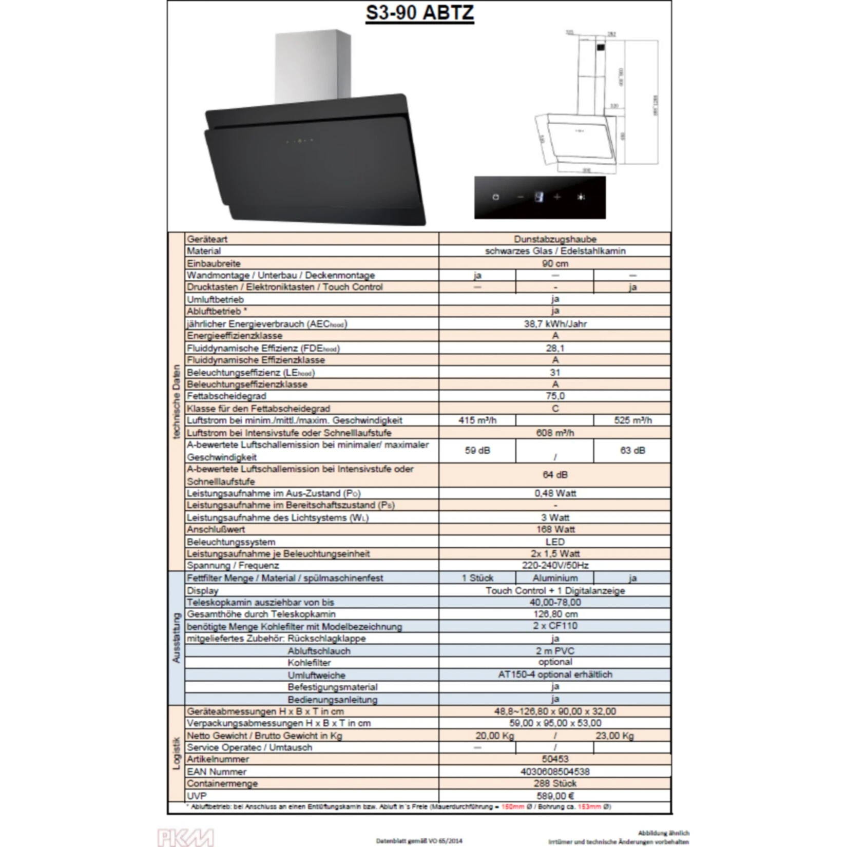 PKM S3-90 ABTZ Dunstabzusghaube schwarzes Glas / Edelstahl