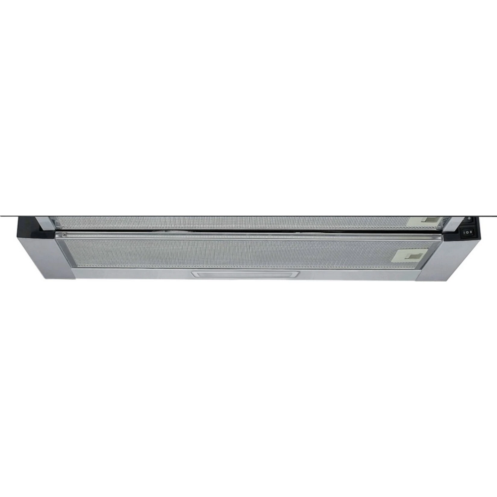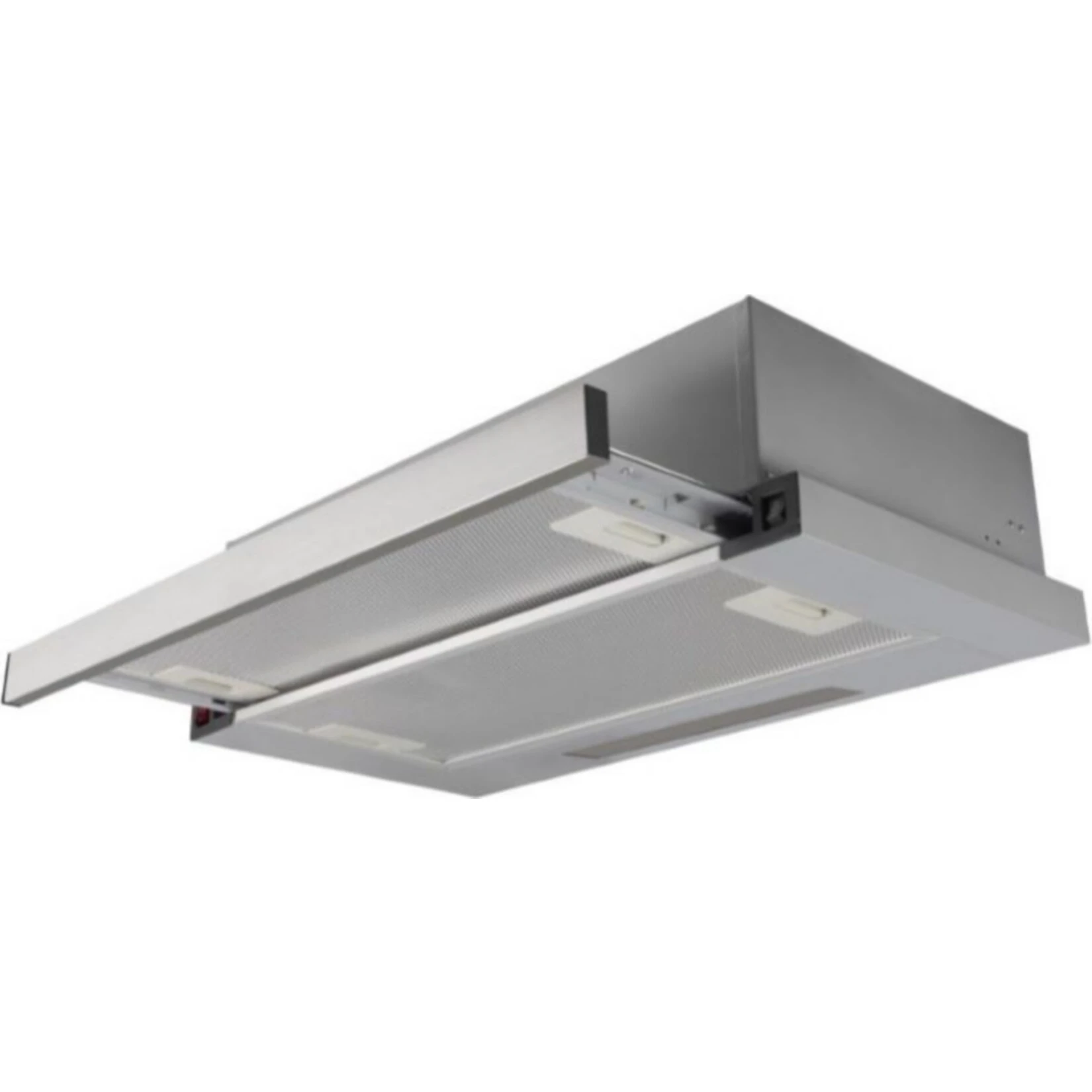Einbau-Dunstabzugshaube ausziehbar aus lackiertem Stahl mit Edelstahlblende und zwei Leistungsstufen. Inkl. 2 waschbaren Metallfettfiltern (Spülmaschinenfest).