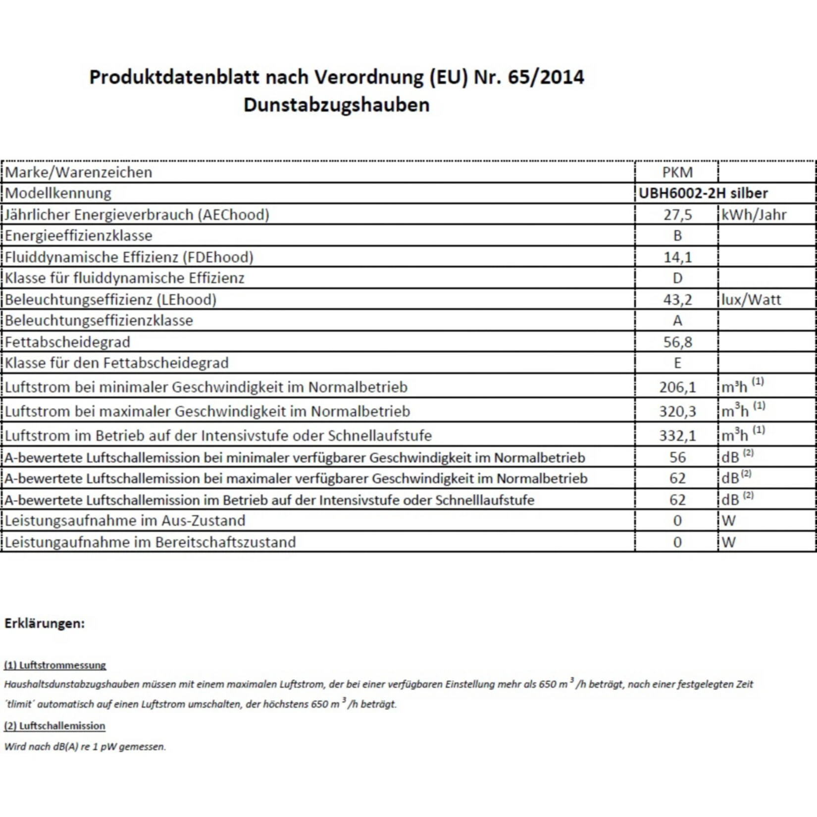 jährlicher Energieverbrauch (AEChood): 27,1 kWh/Jahr