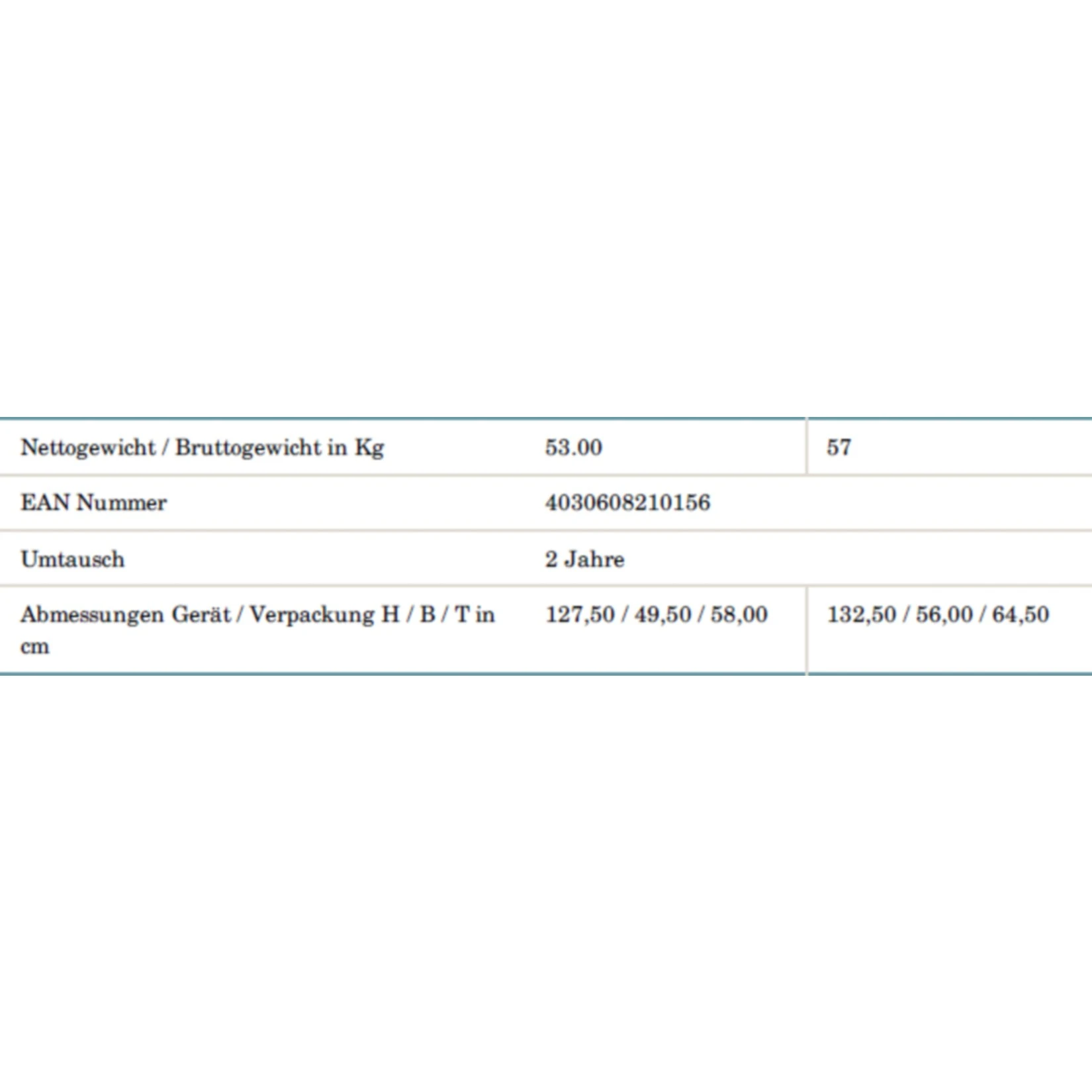 Abmessungen Gerät H / B / T in cm: 127,50 / 49,50 / 58,00