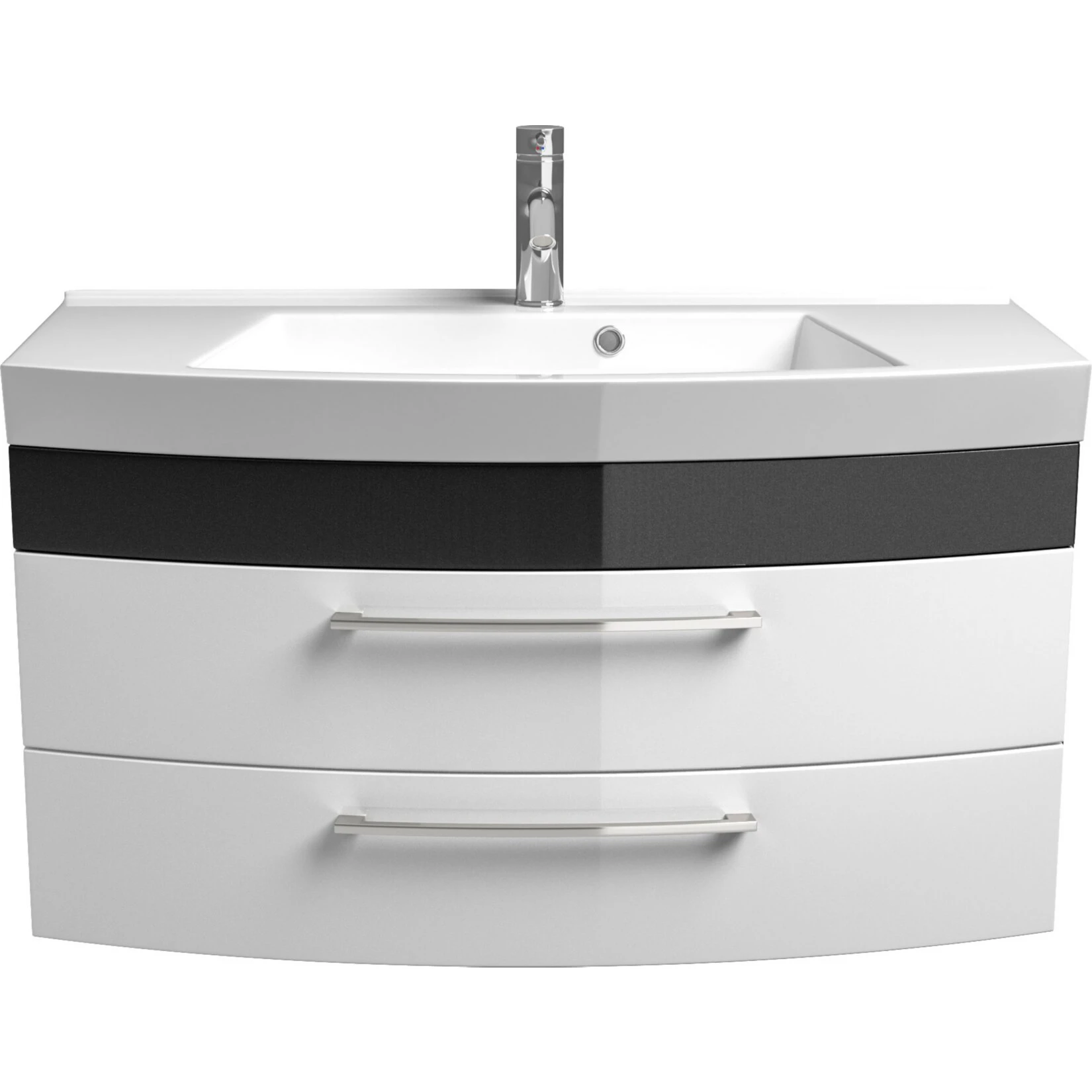 Dieser Waschplatz überzeugt nicht nur aufgrund der hochwertigen Hochglanz – MDF – Fronten, sondern auch durch den geschwungenen Unterbau bietet er einen exklusiven Blickfang für Ihr Bad.