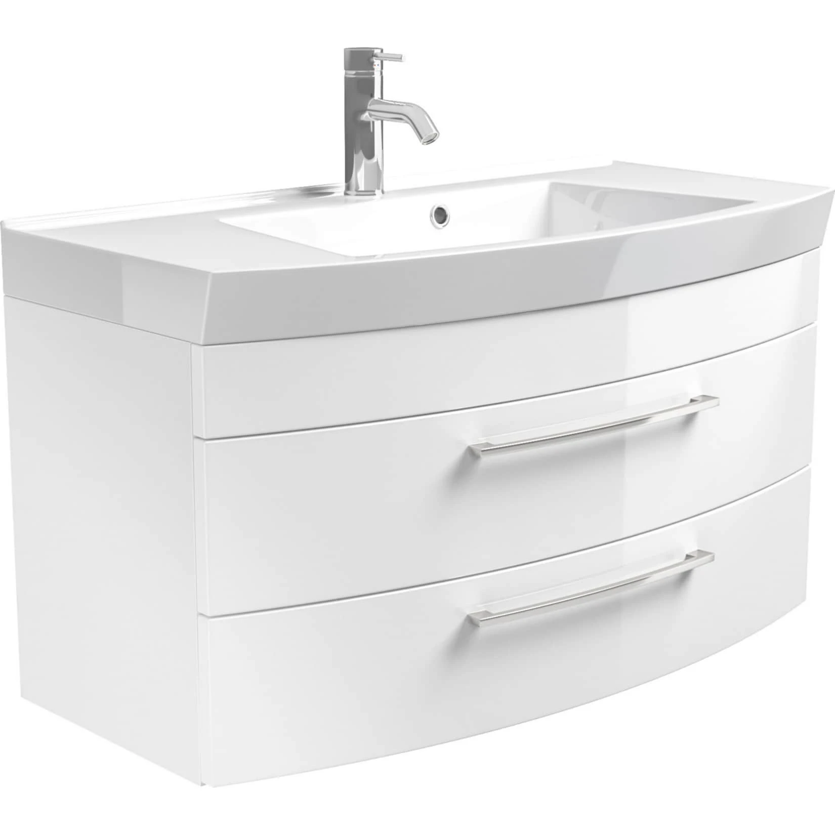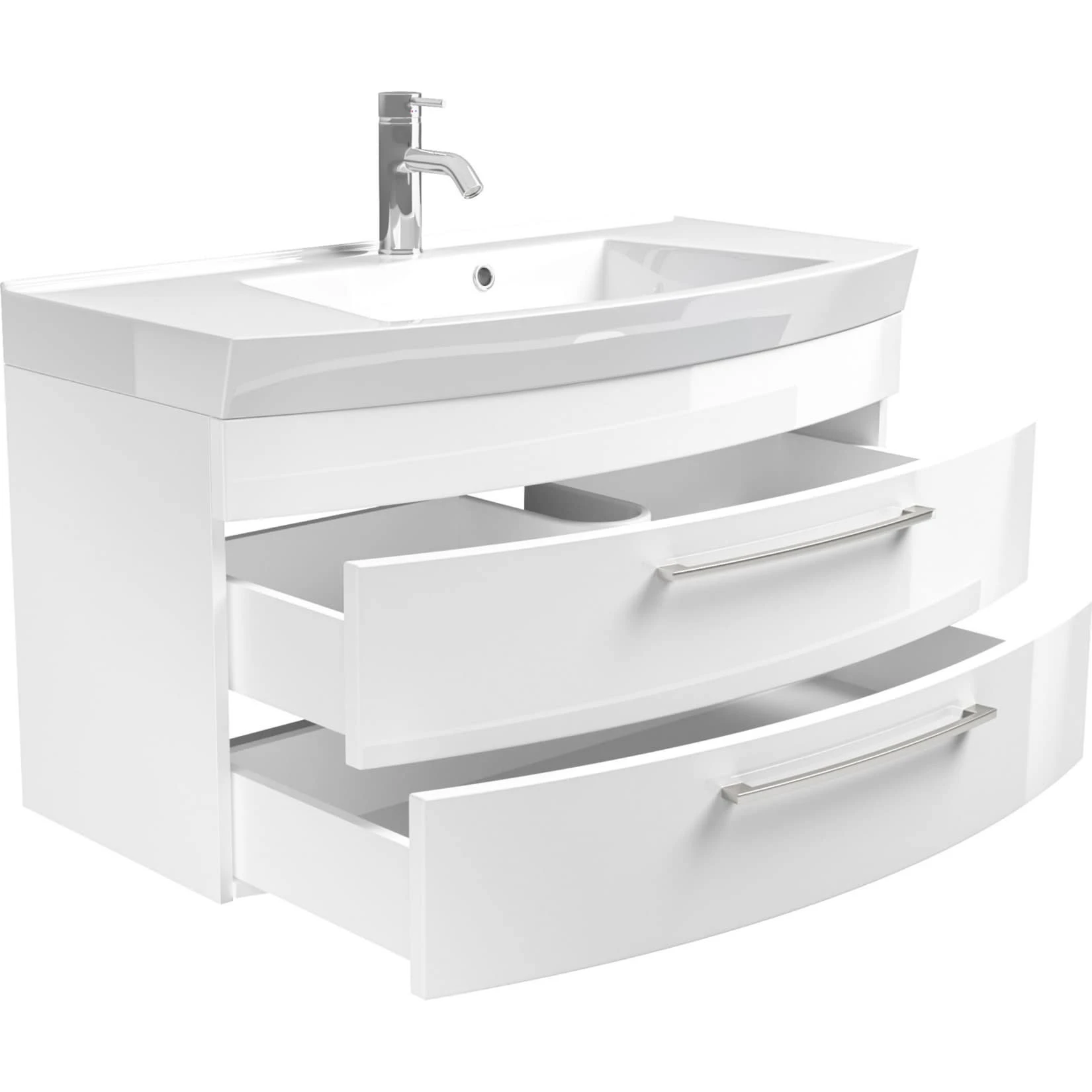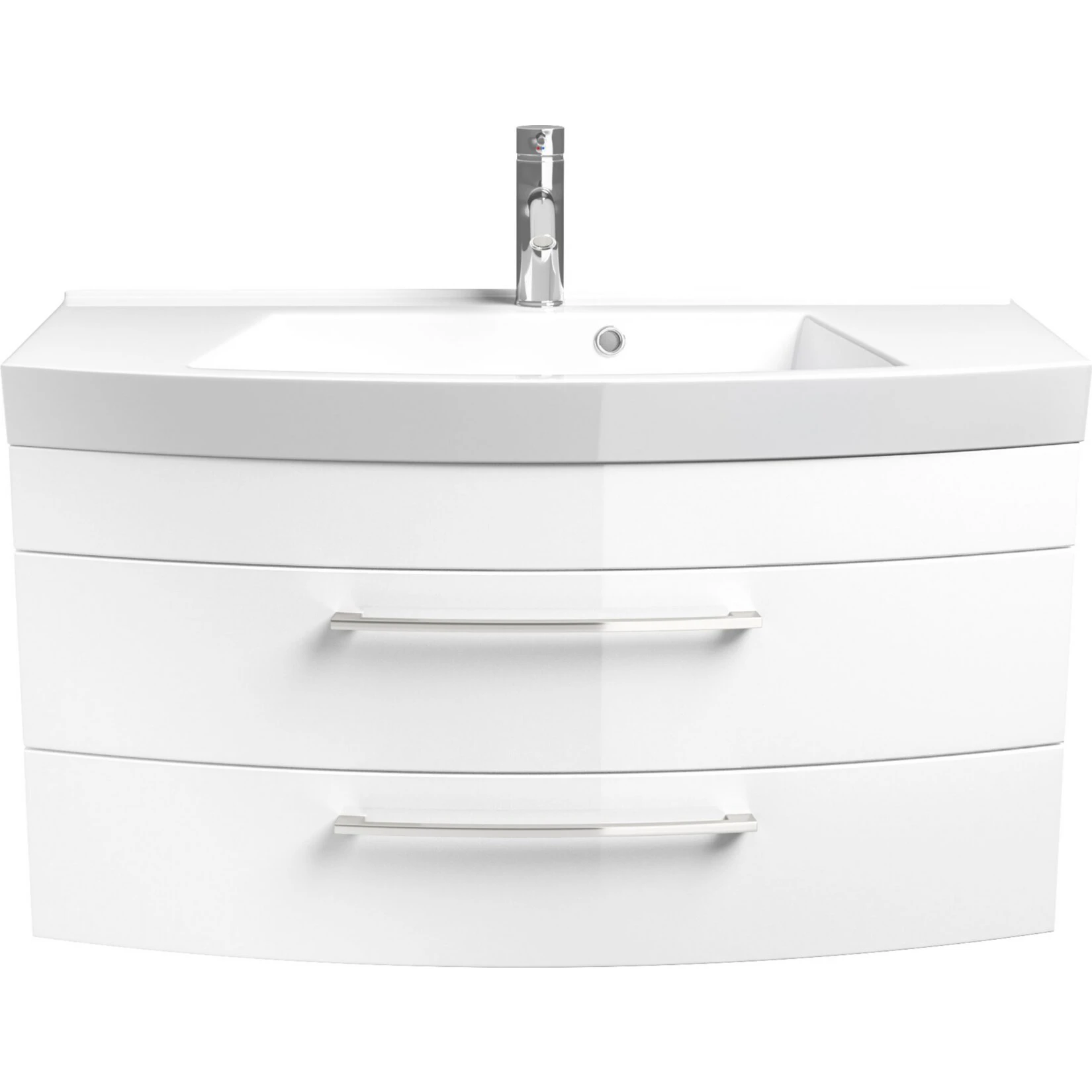 Dieser Waschplatz überzeugt nicht nur aufgrund der hochwertigen Hochglanz – MDF – Fronten, sondern auch durch den geschwungenen Unterbau bietet er einen exklusiven Blickfang für Ihr Bad.
