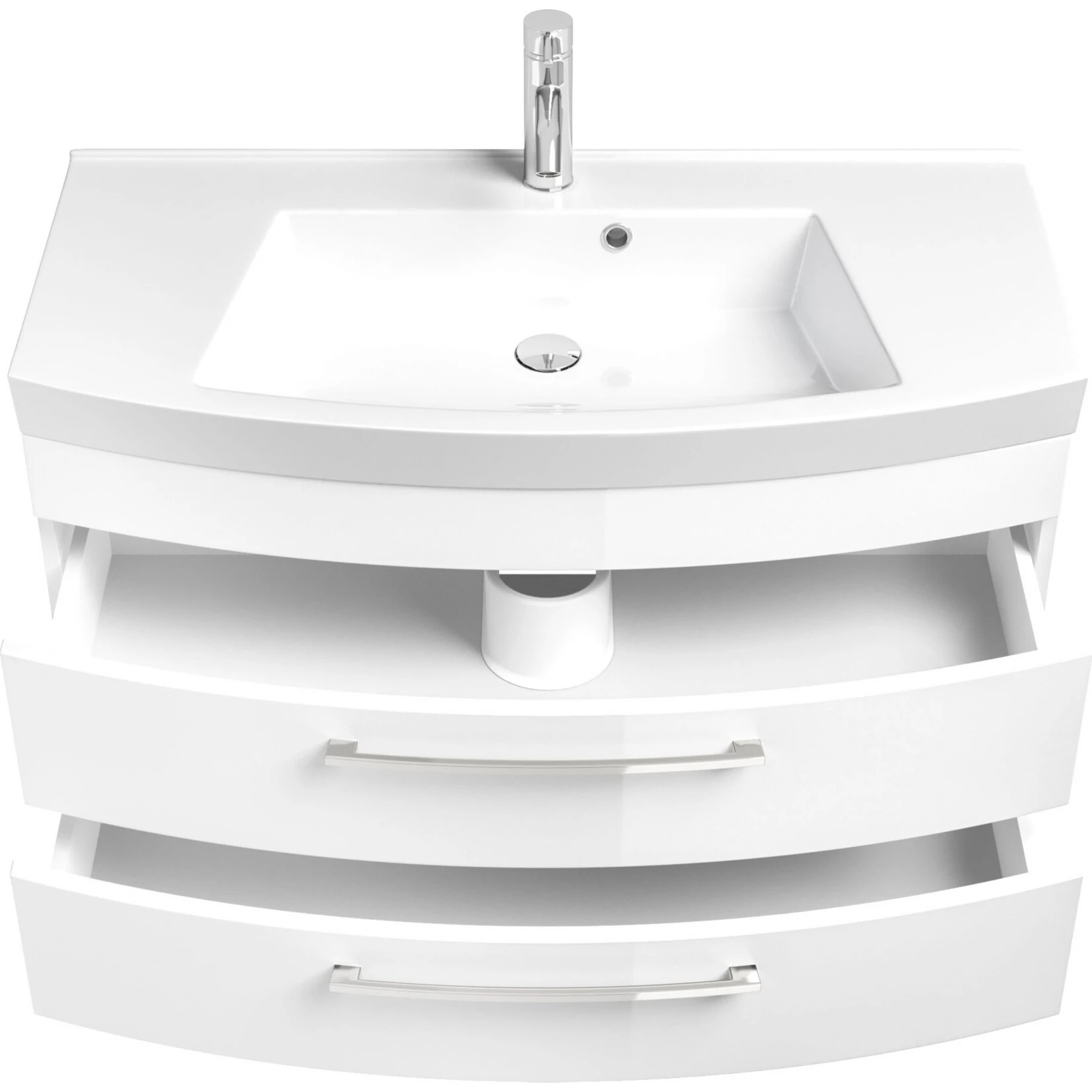 Der Schrank verfügt über 2 Schubladen mit integriertem Siphon – Ausschnitt und Echtmetallgriffen.